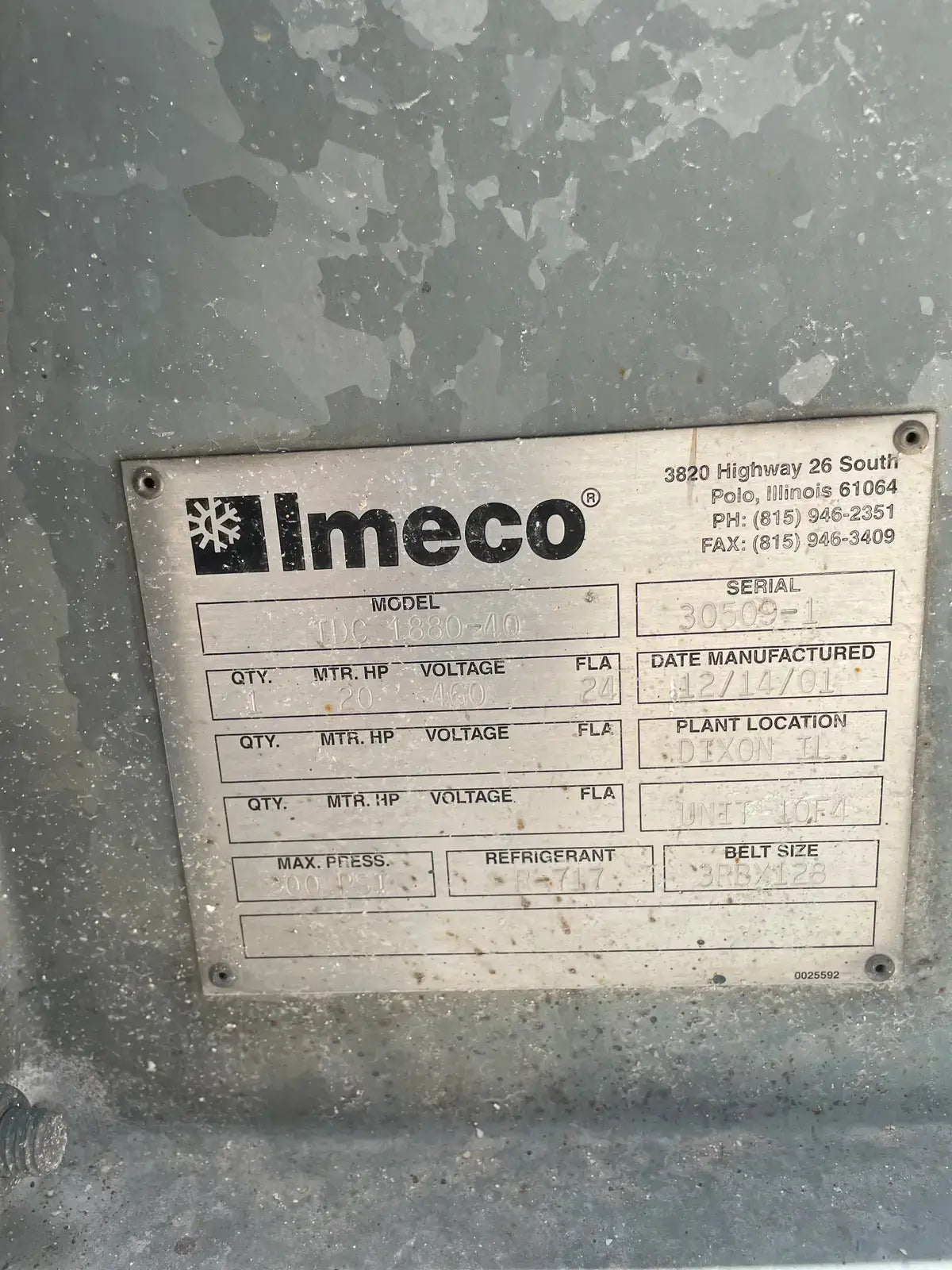Imeco IDC-1880-4Q Evaporative Condenser. Model: IDC-1880-4Q. Serial No: 30509-1. Data Manufactured: 12/14/2001. Max Pressure: 300 PSI. Refrigerant: R-717. Belt Size: BRBX128. Nominal Tons: 470. Ammonia Tons: 333.25. CFM: 79525. Design Pressure: 300 PSI.