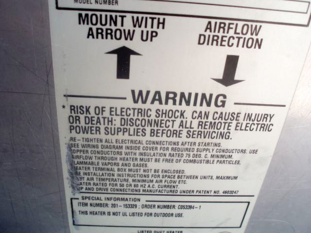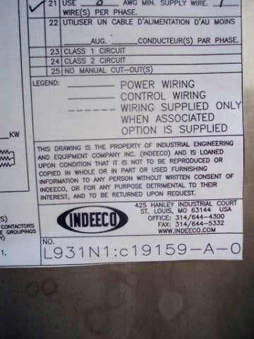 Indeeco Electric Duct Heater. Type: TFZU. DWG No. L931N1: c19159-A-0. P.O. No. RJ04-380. Tag No. RHC-9401.2. Control Panel. Catalog No. 103-A3-480-30I. S/N: 4D04 79184 . Panel power supply: 480 V, 30 amps, 3 phase. No. of Coils: 6. No. of steps: 1. Coil dimensions: 1 in. dia. x 3 ft. 1 in. L. Heater power supply: 25 hp, 480 V, 60 Hz, 3 phase. Inlets/outlets: 3 ft. 4 in. L x 1 ft. W. (duct). Overall dimensions: 4 ft. 5 in. L x 1 ft. 11 in. W x 4 ft. 5 in. H.(ACN31a).