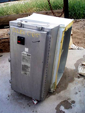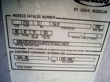 Indeeco Electric Duct Heater. Type: TFXU. 13.1 KW. DWG No. L931N1: C19159-A-0. P.O. No. RJ04-380. Tag No. RHC-9402.7. Control Panel. Catalog No. 103-A3-480-20I. S/N: 1E04 79517. Panel power supply: 480 V, 20 amps, 3 phase. (12) Tubular finned coils. No. of steps: 1. Coil dimensions: 1 in. dia. x 1 ft. 9 in. L. Heater power supply: 17 hp, 480 V, 60 Hz, 3 phase. This is a slip in unit. Inlets/outlets: 2 ft. L x 1 ft. W (duct). Indeeco duct heaters utilize the finest of construction principle and techniques. The coil is constructed of a .475 in diameter stainless steel sheath and contains a 80% nickel, 20% chromium resistance wire insulated from the sheath by a magnesium oxide powder, compacted to rock-like density. The elements are flanged, making them individually removable. All heaters are suitable for installation in ducts with up to one inch of interior lining. Overall dimensions: 2 ft. 1 in. L x 1 ft. 8 in. W x 1 ft. 7 in. H.(ACN28).