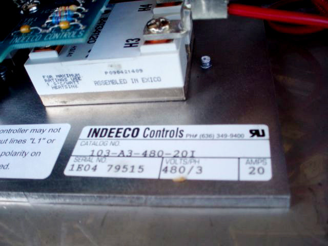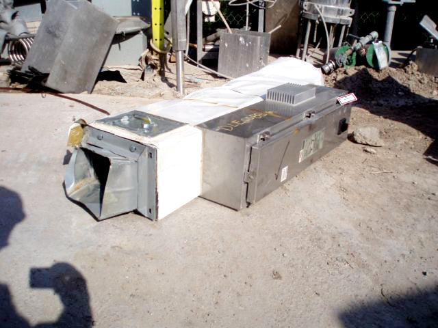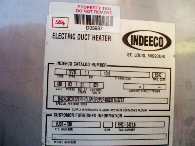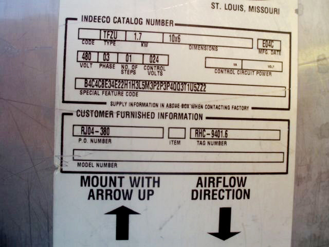Indeeco Electric Duct Heater. Type: TFZU. DWG No. L931N1: C19159-A-0. P.O. No. RJ04-380. Tag No. RHC-9401.6. Control Panel. Catalog No. 103-A3-480-20I. S/N: 1E04 79515. 1.7 KW. Panel power supply: 480 V, 20 amps, 3 phase. (2) Tubular finned coils. No. of steps: 1. Coil dimensions: 1 in. dia. x 8 in. L. Heater power supply: 2 hp, 480 V, 60 Hz, 3 phase. This is a flanged unit. Inlets/outlets: 10 in. L x 6 in. W (duct). Indeeco duct heaters utilize the finest of construction principle and techniques. The coil is constructed of a .475 in diameter stainless steel sheath and contains a 80% nickel, 20% chromium resistance wire insulated from the sheath by a magnesium oxide powder, compacted to rock-like density. The elements are flanged, making them individually removable. All heaters are suitable for installation in ducts with up to one inch of interior lining. Overall dimensions: 1 ft. 10 in. L x 11 in. W x 5 ft. H.(ACN23).