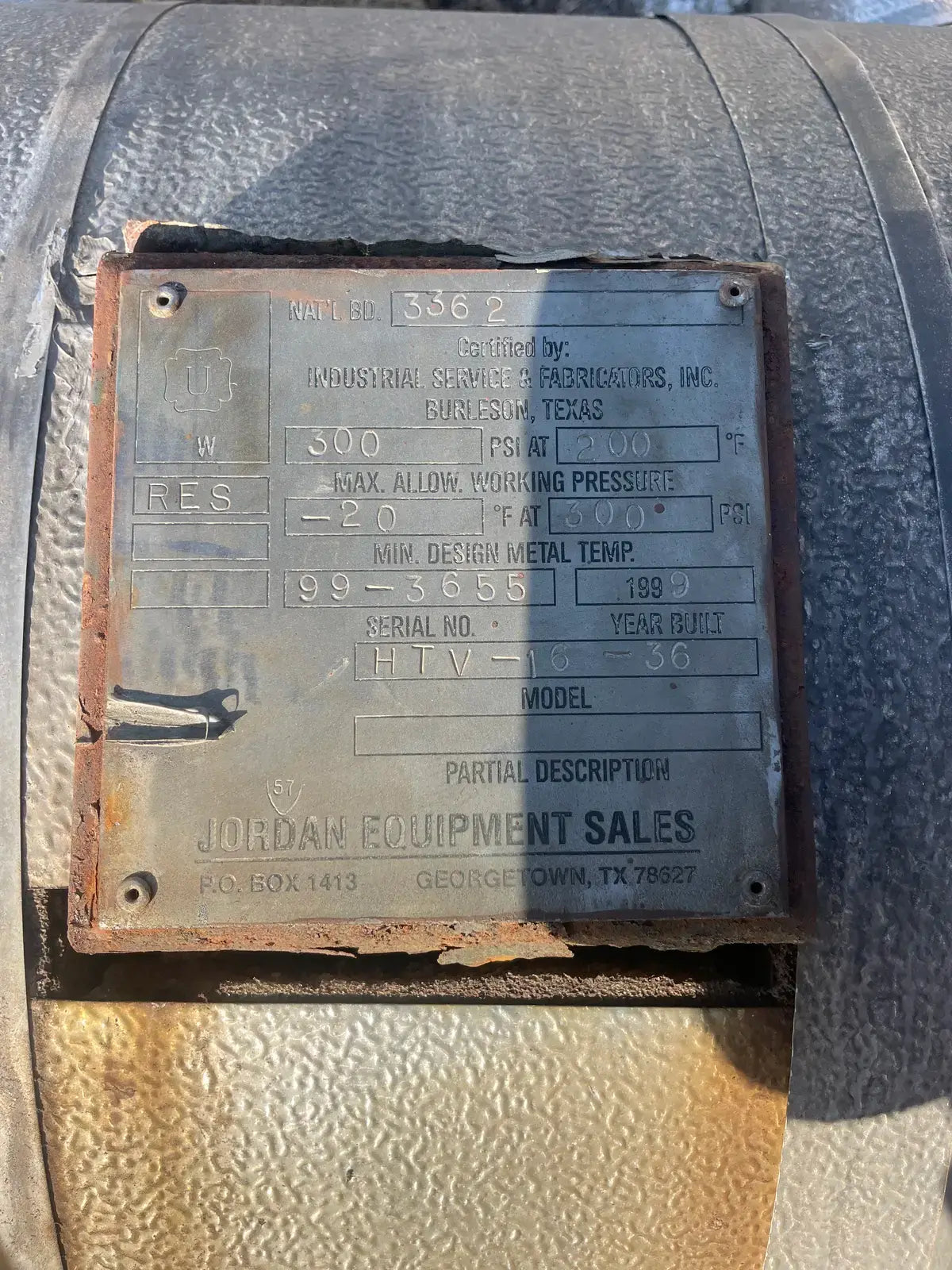 Certifies by Industrial Service & Fabricators Inc Horizontal Ammonia Receiver. National Board: 3362. Model: HTV-16-36. Serial No: 99-3655. MAWP: 300 PSI @ 200 F. MDMT: -20 F @ 300 PSI. Vessel Dimensions: 16 in X 36 in. Estimated Gallons: 40 Gallons.
