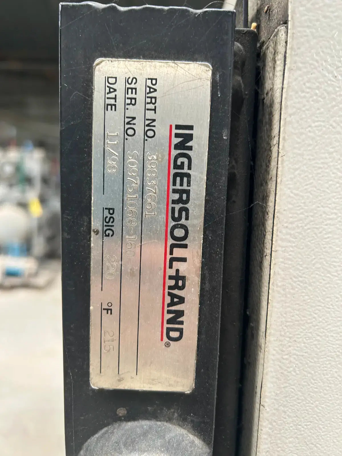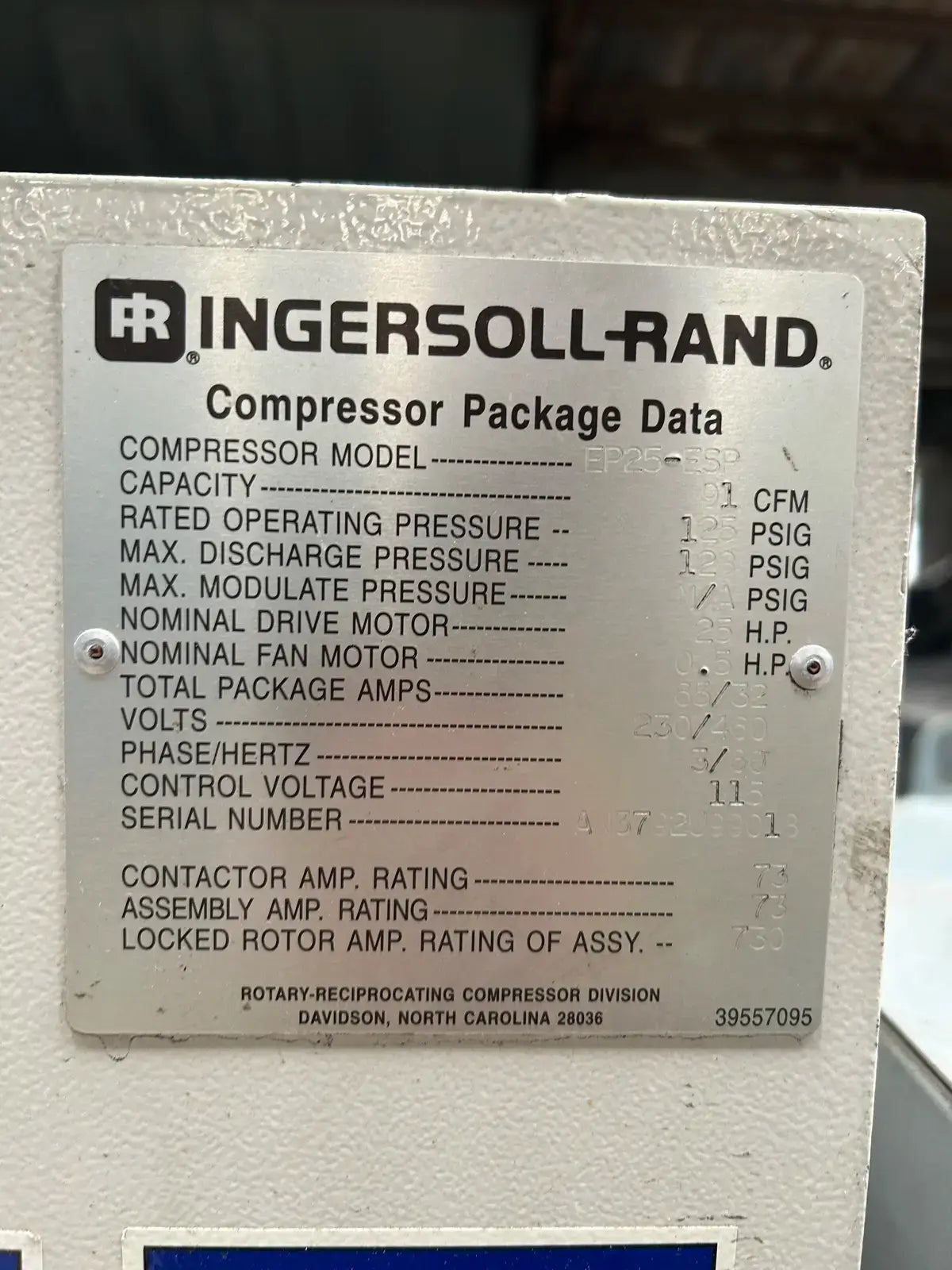 Ingersoll-Rand EP25 Series Screw Air Compressor. Serial No: AN3792U99013. Model: EP25-ESP. Serial No: AN3792U99013. Capacity: 91 CFM. Rated Operating Pressure: 125 PSIG. Max Discharge Pressure: 123 PSIG. Nominal Drive Motor