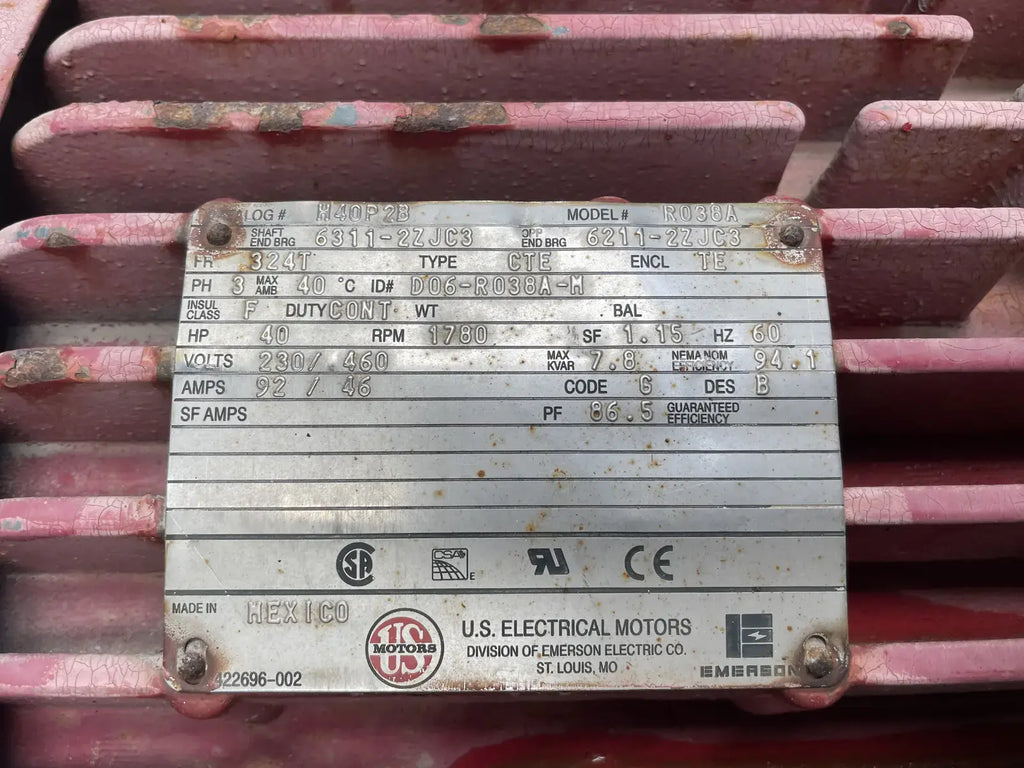 ITT Bell & Gossett 1510 Series Centrifugal Pumps. Serial No: 2229005. Model: 5G 11.125 BF. Rated capacity for new pump is 682 gpm with required horsepower. Maximum working pressure: 175 psi. U.S. Electric Motor, 40 hp. Inlets: (1) 6 in. dia. flanged suction port. Outlets: (1) 5 in. dia. flanged discharge port. Overall dimensions: 6 ft. 1 in. L x 3 ft. 8-1/2 in. W x 4 ft. 2 in. H.