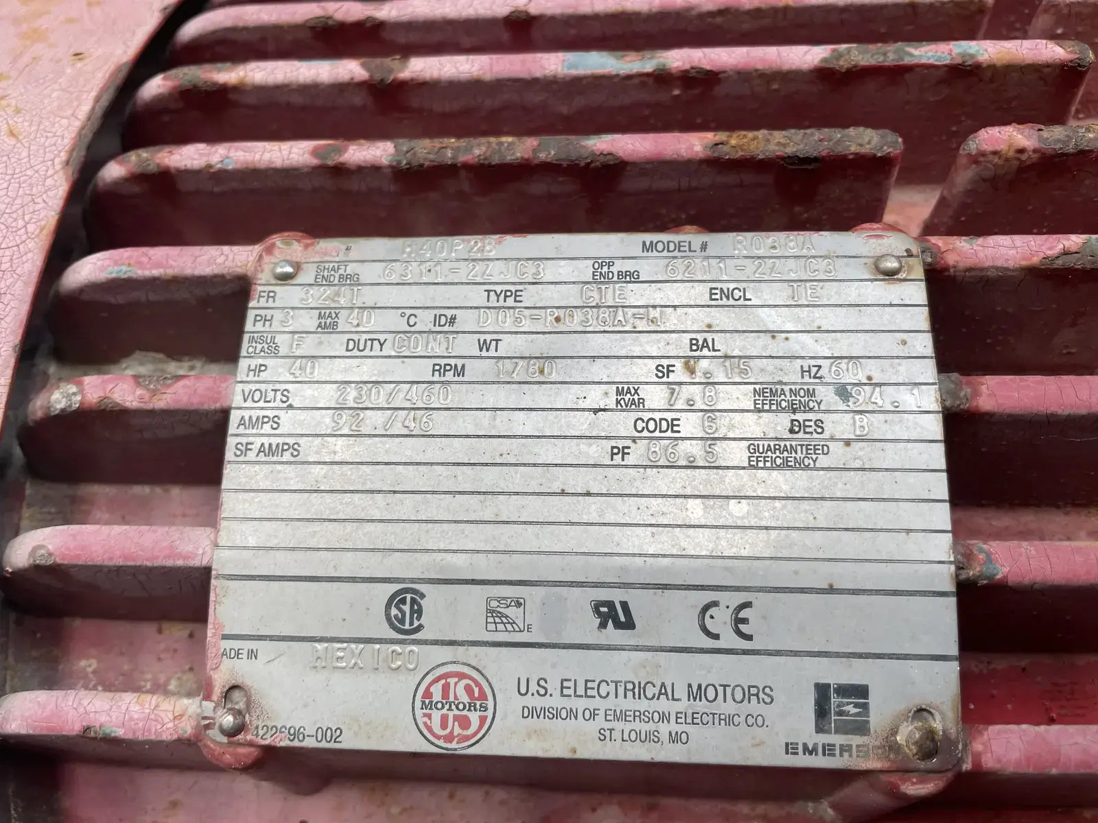 ITT Bell & Gossett 1510 Series Centrifugal Pumps. Serial No:2229010.  Model: 5G 11.125 BF. Rated capacity for new pump is 682 gpm with required horsepower. Maximum working pressure: 175 psi. U.S. Electric Motor, 40 hp. Inlets: (1) 6 in. dia. flanged suction port. Outlets: (1) 5 in. dia. flanged discharge port. Overall dimensions: 6 ft. 1 in. L x 3 ft. 8-1/2 in. W x 4 ft. 2 in. H.