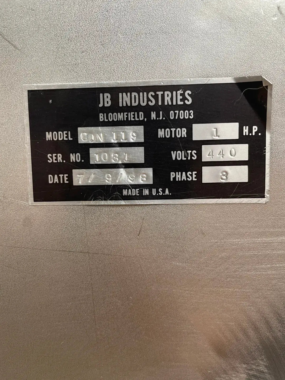 JB Industries Bloomfield, NJ SS Incline Portable Conveyor. Model: CON 119. Serial No: 1031. Manufacture Date: 7/09/98. Power Supply: Motor: 1 HP, Volts: 440, PH:3.