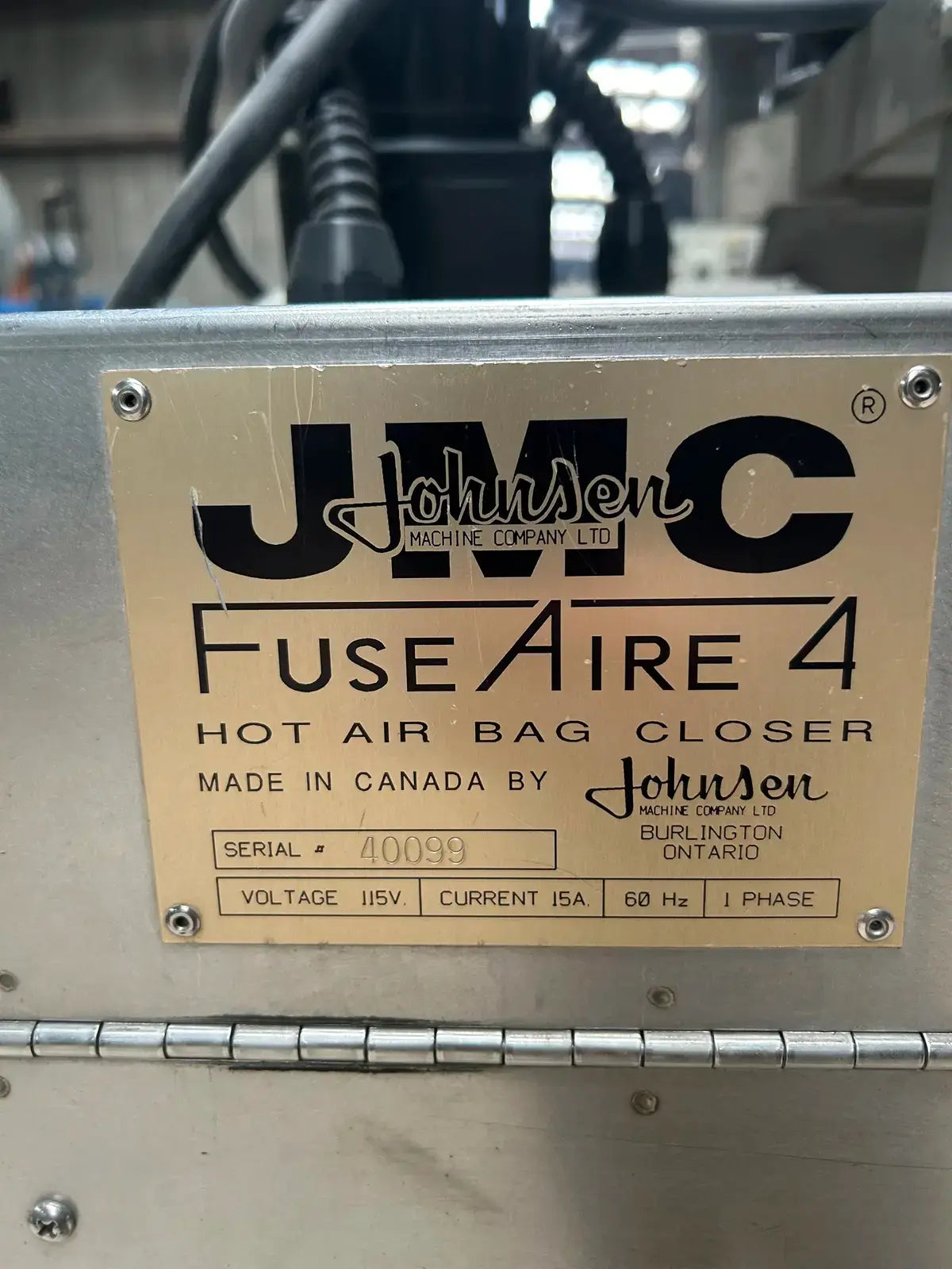 JMC FuseAire 4 Hot Air Sealer. Serial No: 40099. Power Supply - 115 V, 15 Amps, 60 Hz, 1 Ph. Air Requirements: 0.9 CFM @ 80 PSI. Material Capacity: LDPE Films from 1-6 Mils.