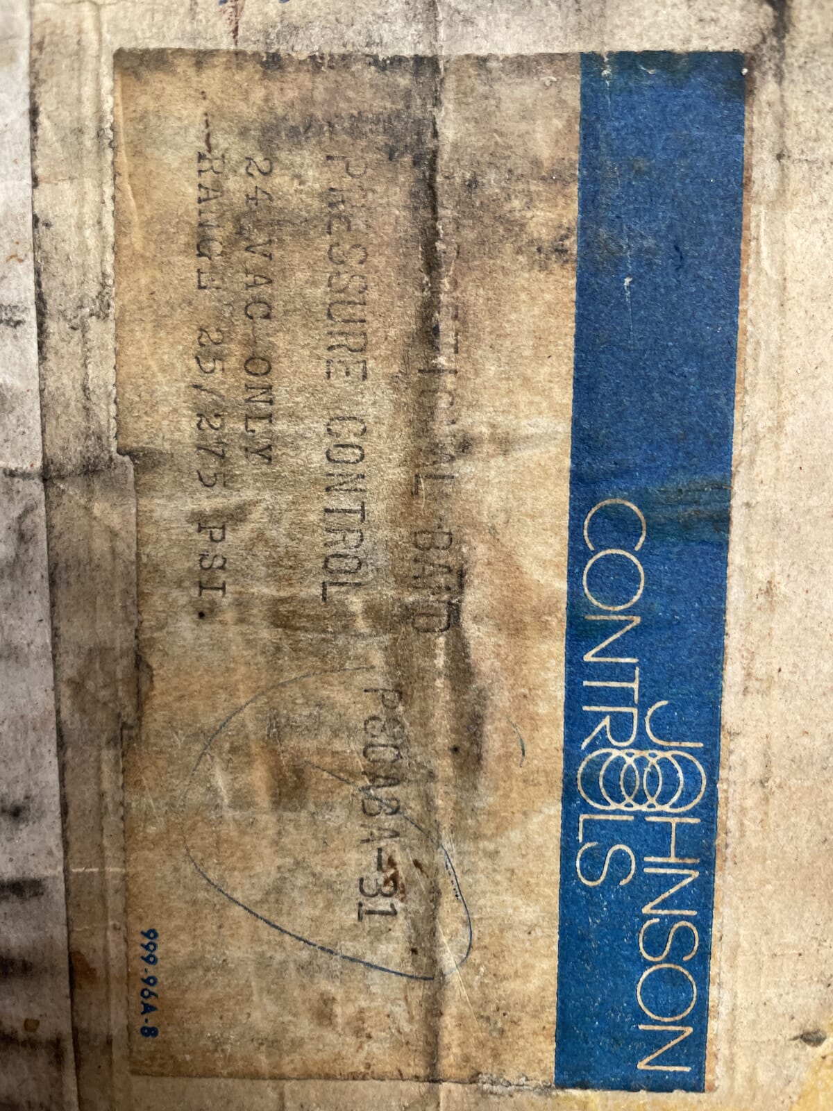 New Johnson Control Pressure Control. Model: P80ABA-4. Power Supply: 24 VAC. Range: 25/275 PSI.
