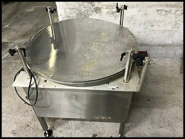 Kalish DT Industries Turntable. Model: 7540. S/N: 0195. Job No. 34984. Table diameter: 3 ft. Table height: 35 inches (adjustable). Boston Gear Motor with Drive, 1/4 hp, 1725 rpm, 110 V, 3 amps, 60 Hz, single phase. Drive, ratio: 30, torque: 374 lb-in., rpm out: 57.5 (final). Overall dimensions: 2 ft. 10 in. L x 2 ft. 10 in. W x 3 ft. 6 in. H.