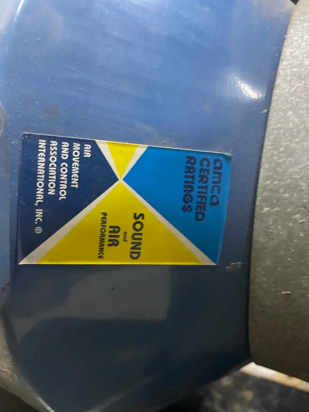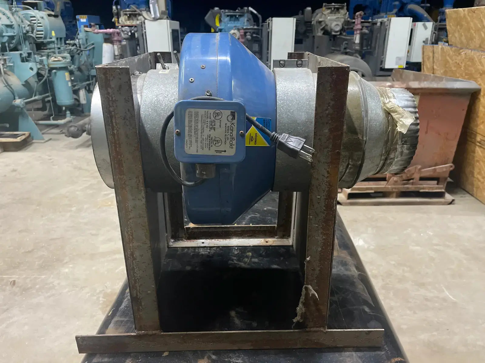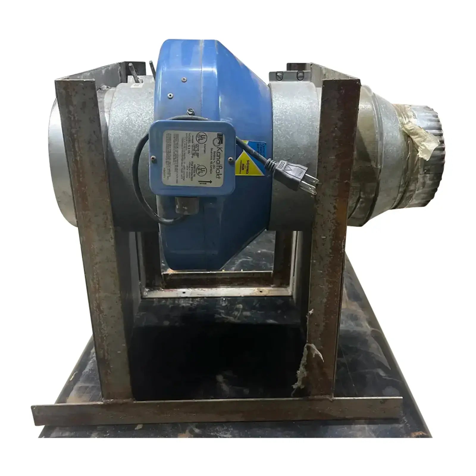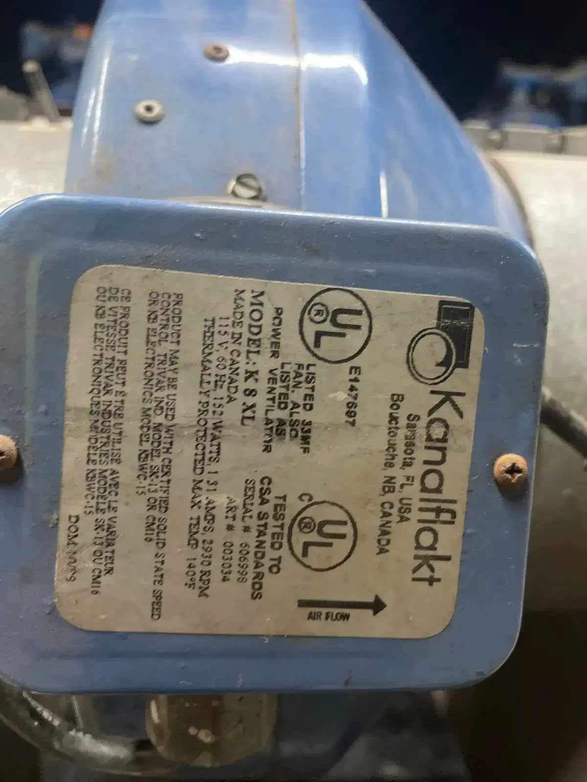 Kanalflakt Inline Duct Fan: 502 cfm max. Model: K8XL, Serial No: 606998. Power supply: 115V, 60 Hz, 152 Watts, 2930 RPM. Thermally protected max temperature 140 F.
