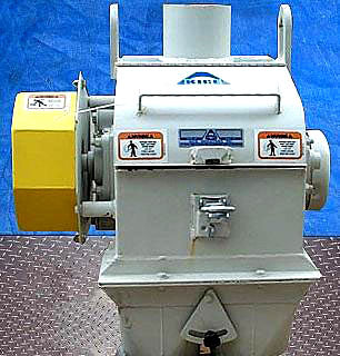 Kice Industries Inc. Rotary Stream Splitters. Model: RSA5-2. S/N: 177481. Rotor assembly: 8 in dia. x 10-1/2 in. L. Inspection Door. Totally enclosed OSHA type chain guard. Adjustable motor mounts. Baldor Super-E Motor, 1 hp, 1750 rpm. 230/480 V, 2.0/1.4 amps, 60 Hz, 3 phase. Kice Speed Reducer, ratio: 1/29, 60.34 rpm out. Inlets: (1) 5 in. dia. infeed. Outlets: (2) 5 in. dia. discharge ports. Overall dimensions: 28-1/2 L x 24 in. W x 25-1/2 in. H.