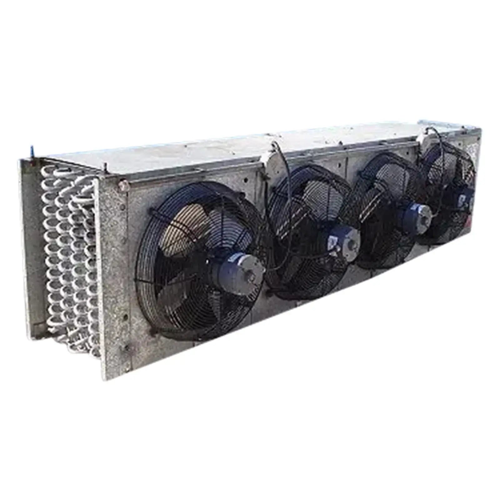 (3) 1995 Krack 4-Fan Ammonia Evaporator. Model: DT4S-1045-RBA-HGC-RH. Refrigerant: recirculated R-717 (ammonia). Nominal capacity: 104,450 Btuh for a 10ºF TD or 8.7 tons. Design psig: 302. Power supply: 460V, 3-phase. Tube material of construction: galvanized steel. Number of fans: 4. Fan diameter: 1 ft. 10 in. Fin material of construction: galvanized steel. Fins per inch: 3. These feature hot gas defrost. (4) MagneTek Century AC motor, 1/2 hp, 460V, 60Hz, 3-phase. Inlets/outlets: 2 in. suction port, 2 in. liquid line and a 1-1/2 in. drain pan line. Overall dimensions: 11 ft. L x 2 ft. 10 in. W x 2 ft. 7 in. H.(ACN77)(H15).