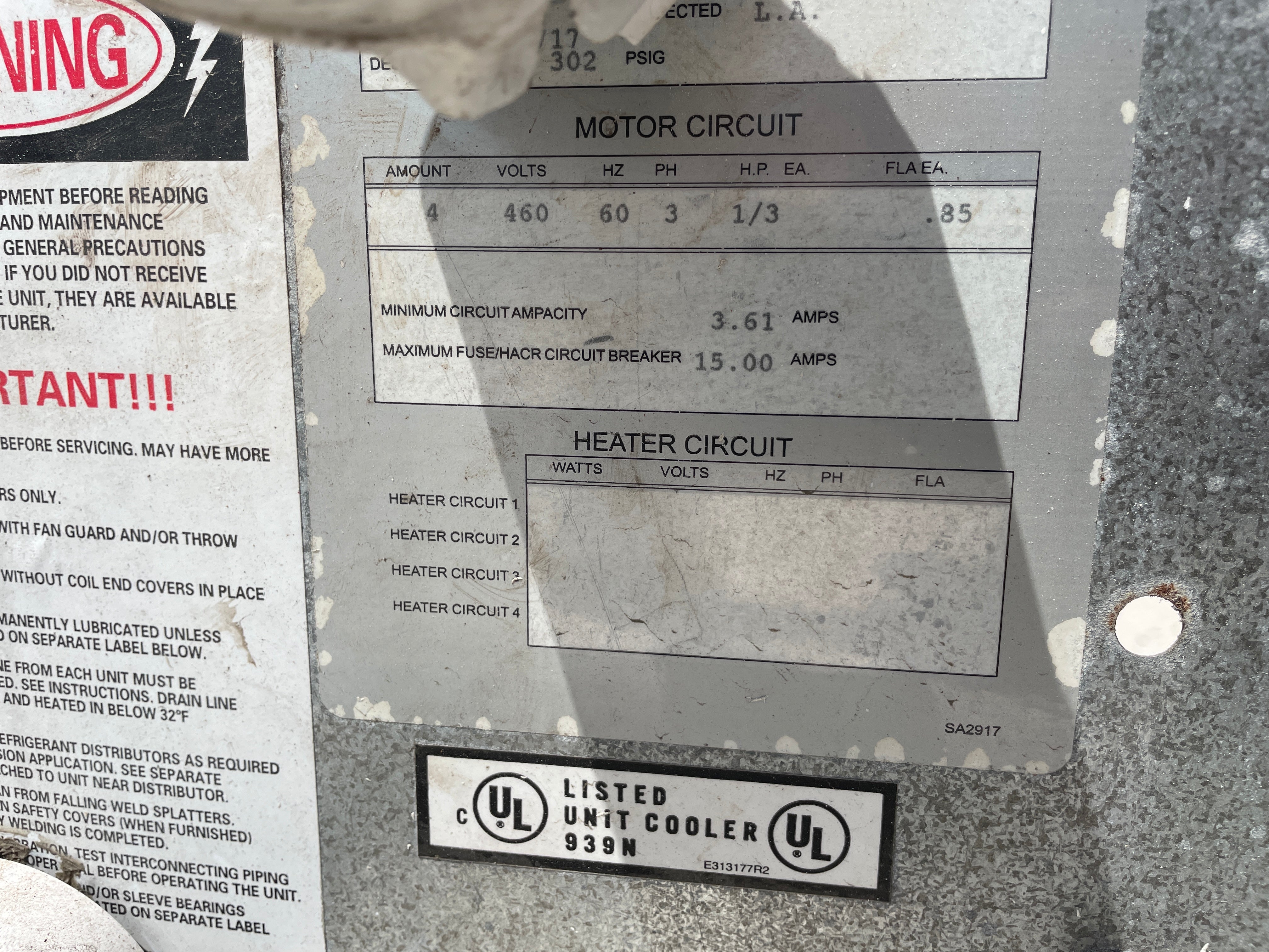 - If Multiple Motors, Motor Descriptions vs specs: Fan Motors(4): 460 Volts, PH:3, Hz: 60.