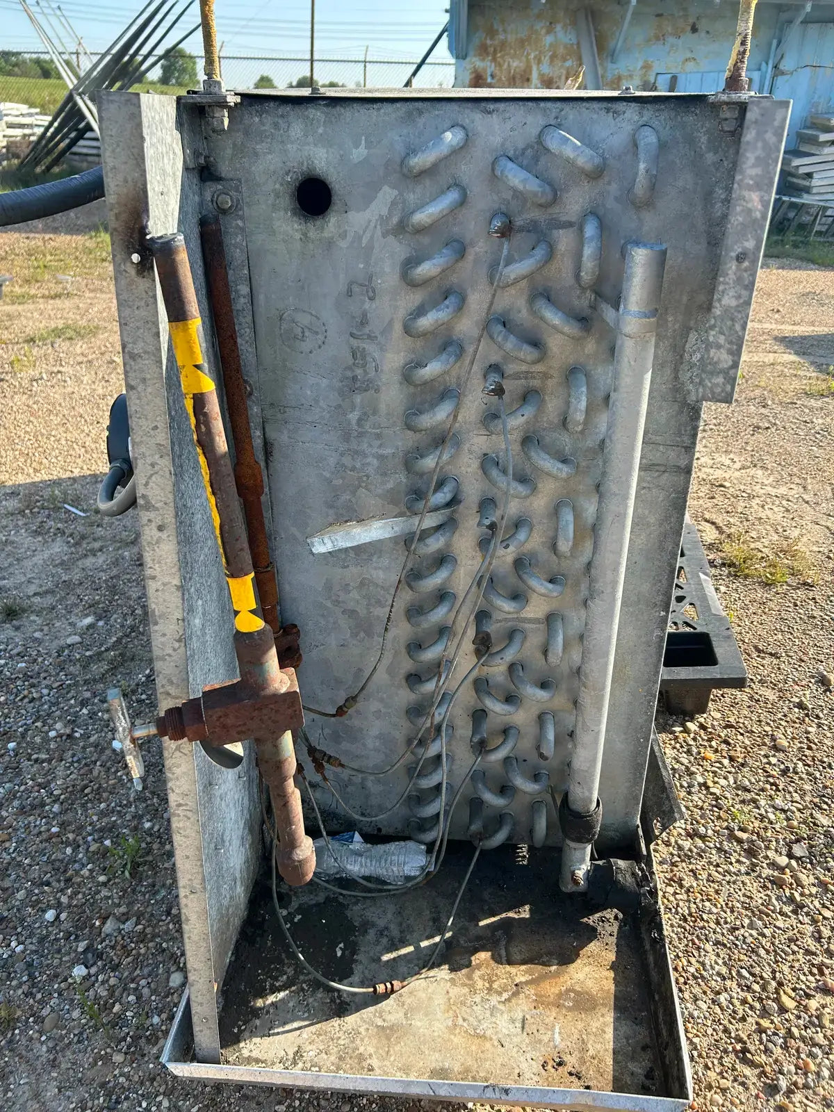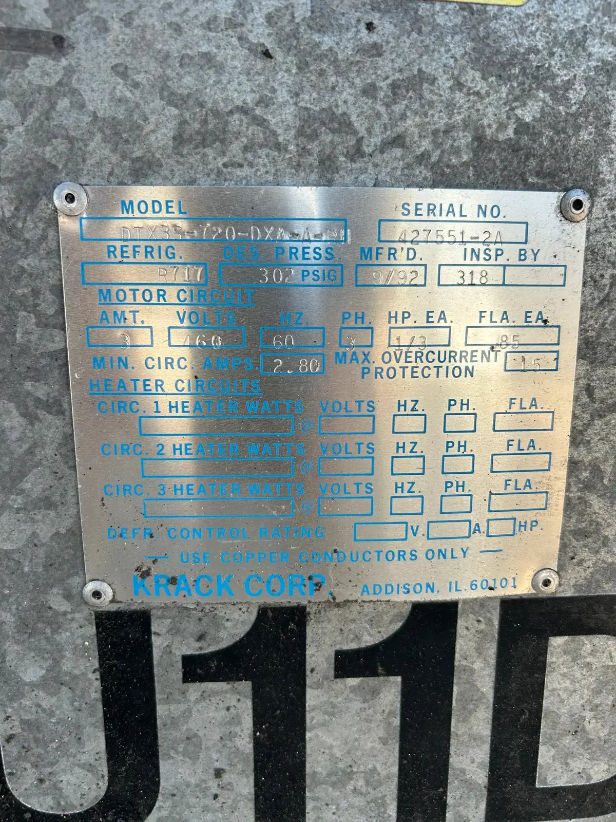 Krack DT Series Ammonia Evaporator Coil. Model: DTX3S-720-DXA-A-RH. Serial No:427571-2A. Design Pressure: 302 PSI. Refrigerant: R-717(Ammonia). Fins Per Inch: 3. CFM: 13,800.