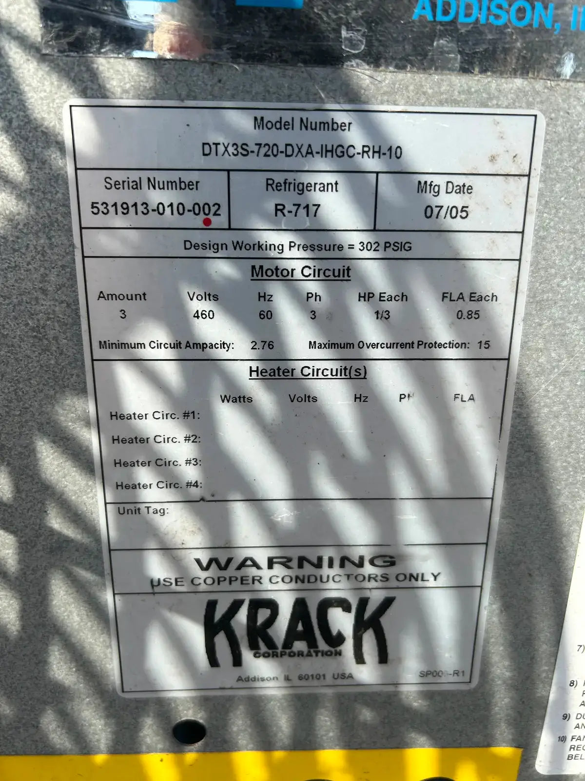 Krack DT Series Ammonia Evaporator Coil. Model: DTX3S-720-DXA-IHGC-RH-10. Serial No: 531913-010-002. Design Pressure: 302 PSI. Refrigerant: R-717(Ammonia). Fins Per Inch: 3. CFM: 13,800.