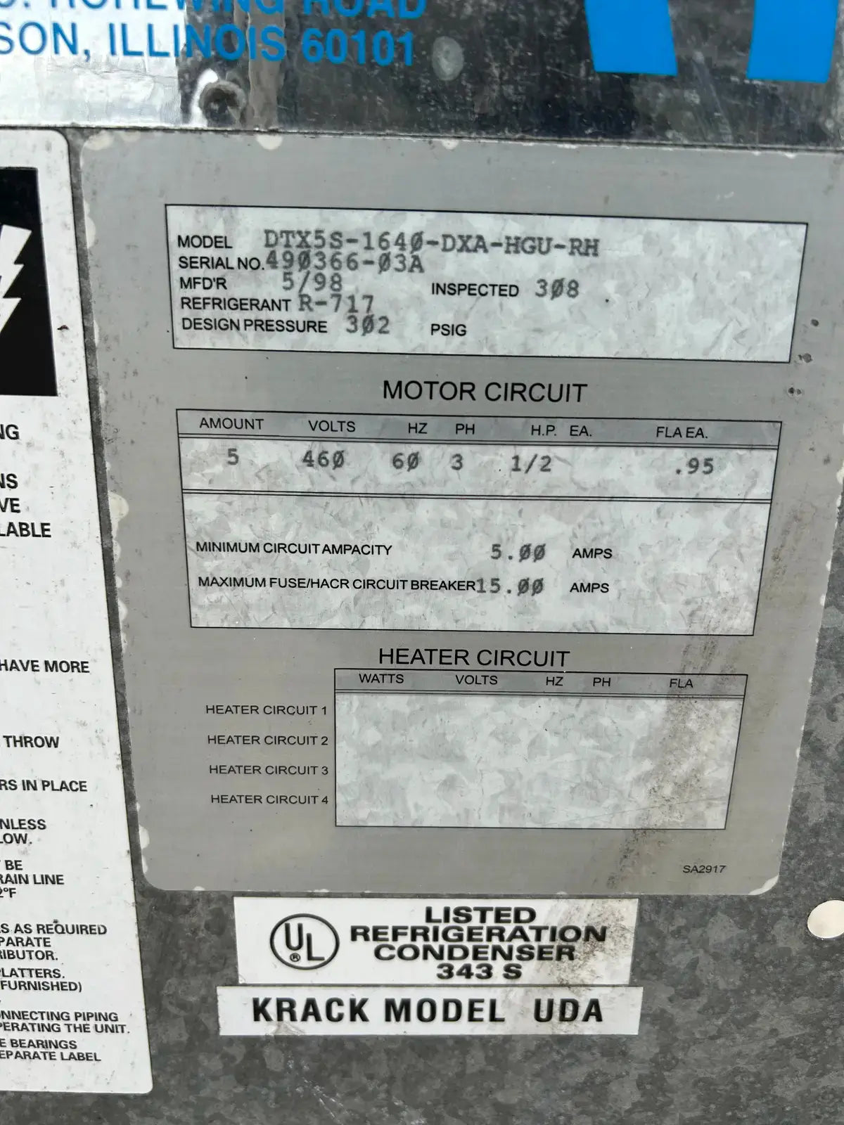 Krack DT Series Ammonia Evaporator Coil. Model: DTX5S-1640-DXA-HGU-RH. Serial No: 490366-03A. Design Pressure: 302 PSI. Refrigerant: R-717(Ammonia). Fins Per Inch: 3. CFM: 22,850.