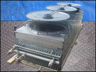 (2) Krack Stainless Steel Ammonia Evaporators. Rated capacity: approximately 12,440 BTUH/ºTD using liquid, re-circulated bottom feed ammonia, or 10 tons with a temperature change of ten degrees. Hot dipped galvanized steel coil with steel tubing and fins, (8) rows of tubes at (4) fins per inch. Cooling area: 3048 sq. ft. Air flow: 16,200 cfm. (3) Franklin electric motors, 1/2 hp, 1140 rpm, 208-230/460 V, 1.96-2.24/1.12 amps, 60 Hz, 3 phase. Features include a hot gas coil and a electrically heated drain pan. Fan diameters: 2 ft.5-1/2 in. (1) Access door 9 ft. 9 in. L x 1ft. 3 ½ in. H. Coil Inlet/Outlet : (3) 1 in., (1) 2 in., (1) 1-1/2 in. (drain). Overall dimensions: 11 ft. 5 in. L x 3 ft. 7 in. W x 3 ft.(H15)(ACN101).