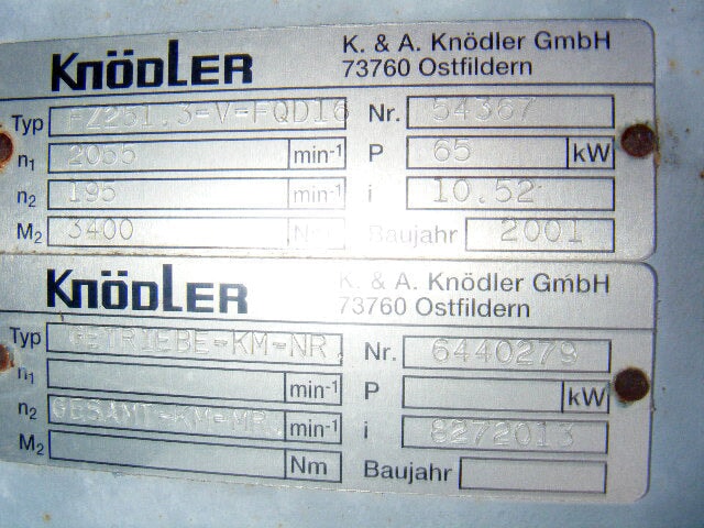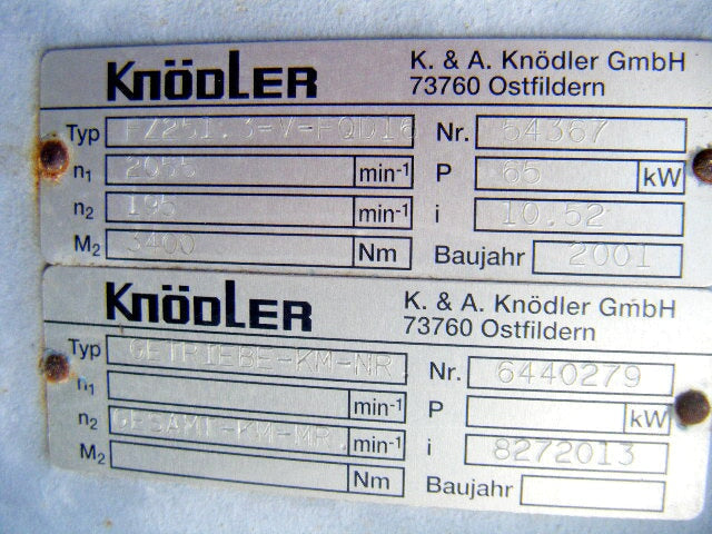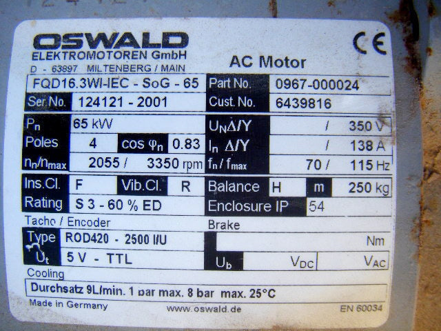 2001 Krauss Maffei Screw Motor & Gearing. Typ: FZ251.3-V-FQD16, GETRIEBE-KM-NR. Oswald electric motor: 3350 rpm, 138 amps, 350 V, 115 Hz. Cooling: Flow-rate 9L/min. 1 bar max. 8 bar max. 25ºC / 77ºF. Overall dimensions: 3 ft. 8 in. L x 2 ft. 3 in. W. x 1 ft. 1 in. H.