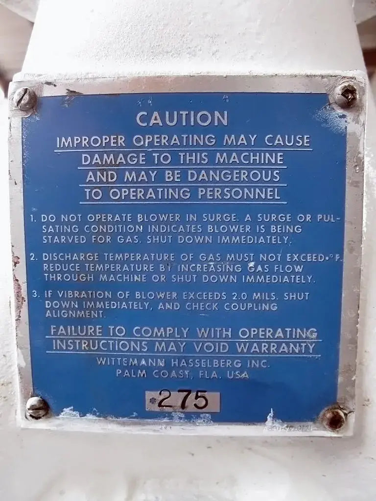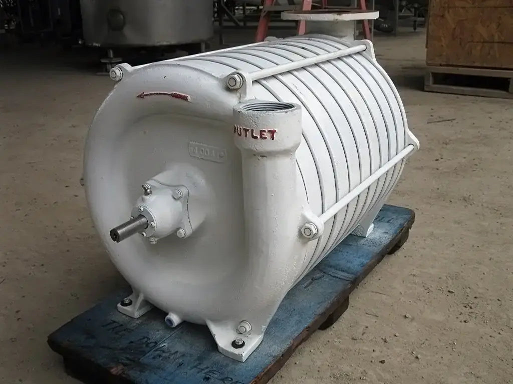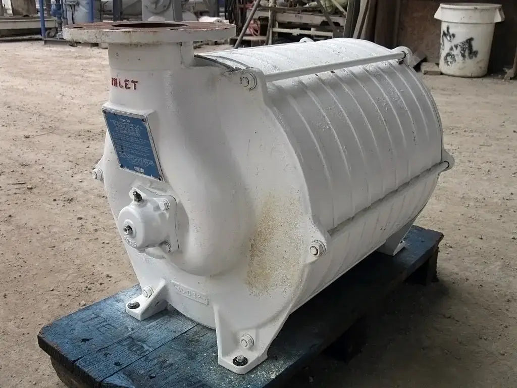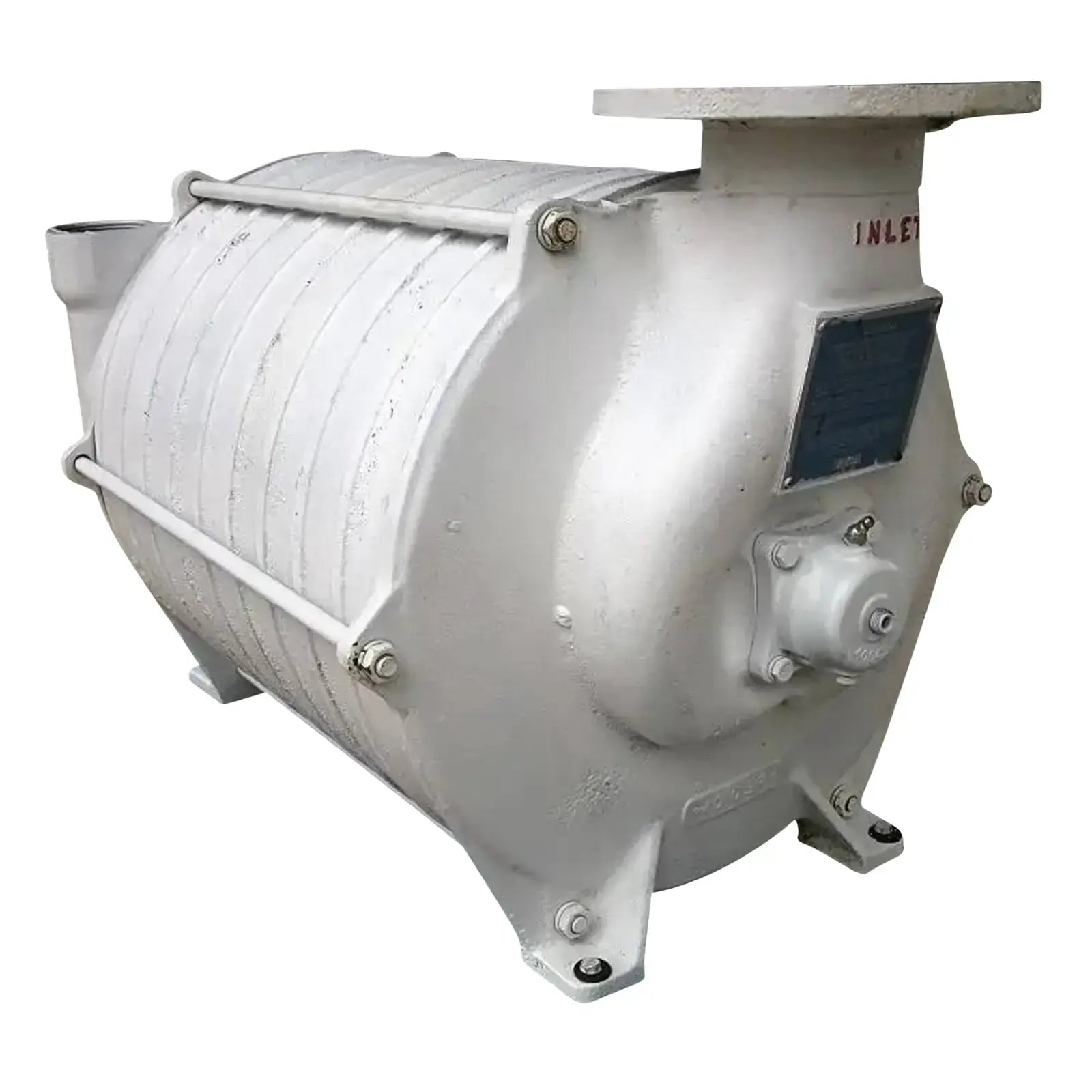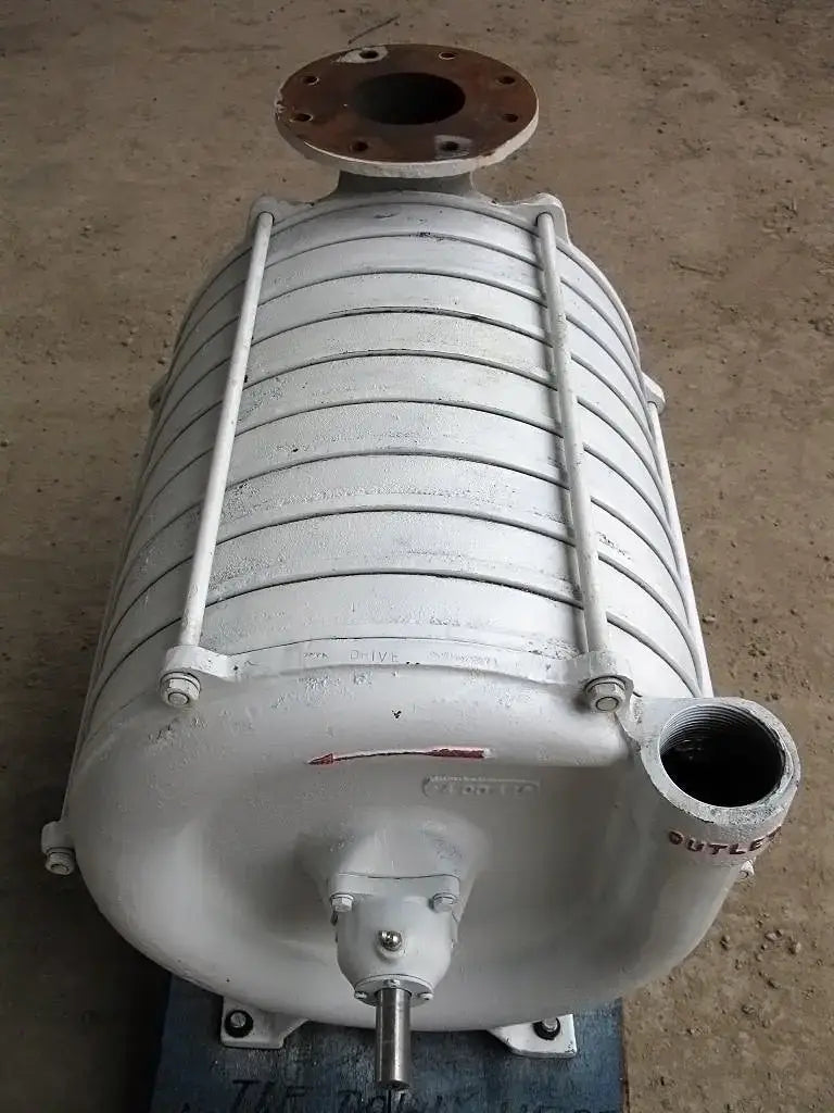 Large Multistage Booster Pump / Blower. (1) Inlet: 4 in. inner flange dia. with (8) ½ in. dia. mounting holes, 3 in. adjacent, 7-1/2 in. opposite. (1) outlet: 2-3/4 in. inner dia. FNPT. Overall dimensions: 2 ft. 10 in. L x 1 ft. 8-1/2 in. W x 1 ft. 8-1/2 in. H.(GS).