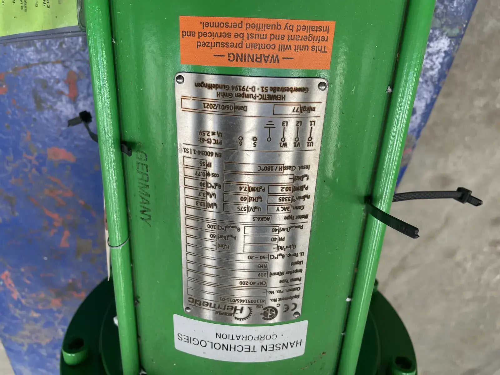 Lederle Hermetic Refrigeration Centrifugal Pump. Pump Type: CNF 40-200. Serial No: 4110031465/011-01. Motor Type: AGX6.5. Impeller Size: 8 in. Liquid: NH3.