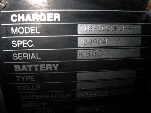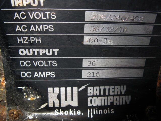 Lifeguard 36 Volt Battery Charger. Mfg: KW Battery Company. Model 18-1050F3B-22. Type: LA, cells: 18, ampere hour: 876-1050. (Input) AC volts: 208/240/480, AC amps: 36/32/16, 60 Hz, 3 phase. (Output) DC volts: 36, DC amps 210. Unit features independent lights for varied battery and charger status and a toggle button to interrupt battery charging as desired.(H10).
