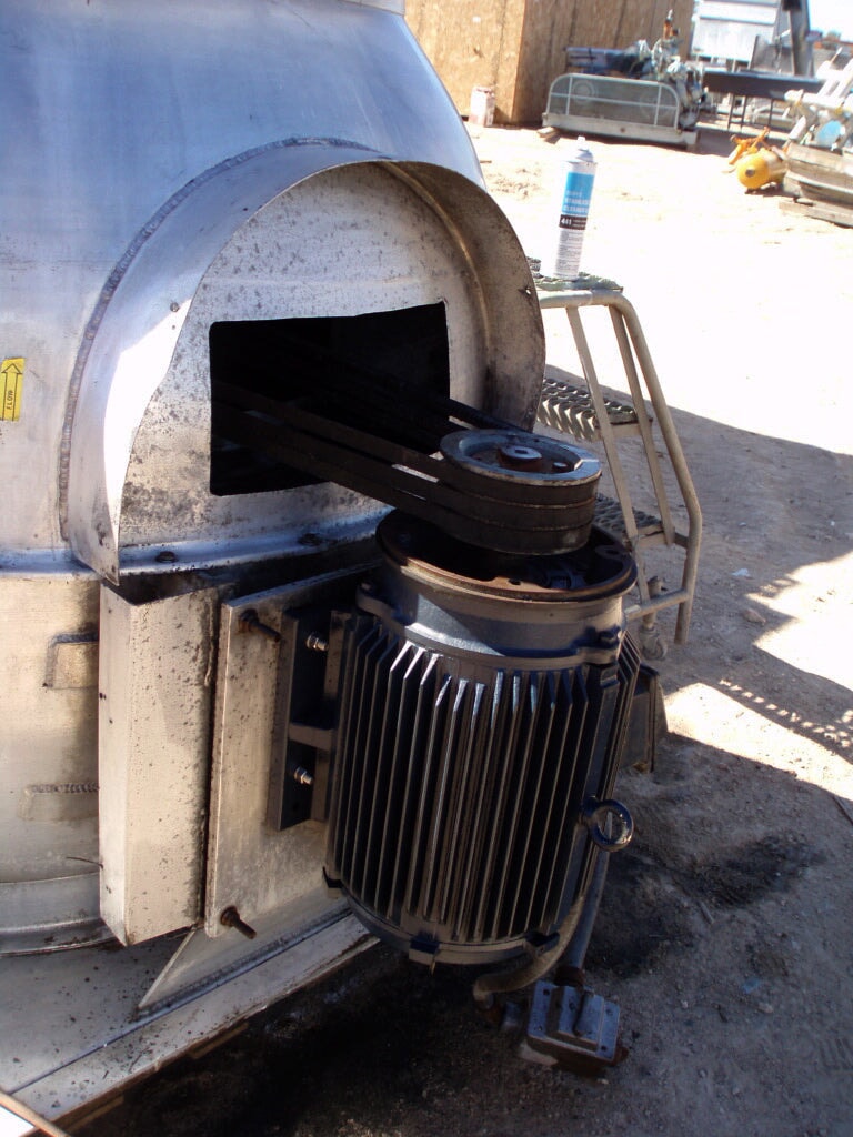 Loren Cook Company Exhaust Vent Fan. Fan diameter: 4 ft. 2 in. Estimated CFM: approximately 1,400. Leeson electric motor, 10 hp, 1760 rpm, 208-230/460 V, 26.7-25.2/12.6 amps, 60 Hz, 3 phase. Inlets: (1) 3 ft. 4 in. dia. port (suction). Outlets: (1) 3 ft. 4 in. dia. port. Overall dimensions: 6 ft. 10 in. L x 4 ft. W x 6 ft. H.(H17).