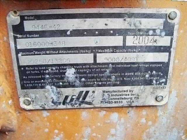 2004 Lull 4x4x4 Telescopic Telehandler Forklift. Model: 944E42. Rated capacity: 9,000 lbs. Cummins Diesel 4 cylinder, 42 ft., 3 section boom, aux hydraulic, hydraulic leveling. Tire size: 15-5-25. (3) steering modes: 4 wheel, front wheel, crab mode. Overall dimensions (retracted): 26 ft. 8 ft. L x 8 ft. 4 in. W x 7 ft. 9 in. H. Hour meter reading: 4100 hrs.(ACN902).