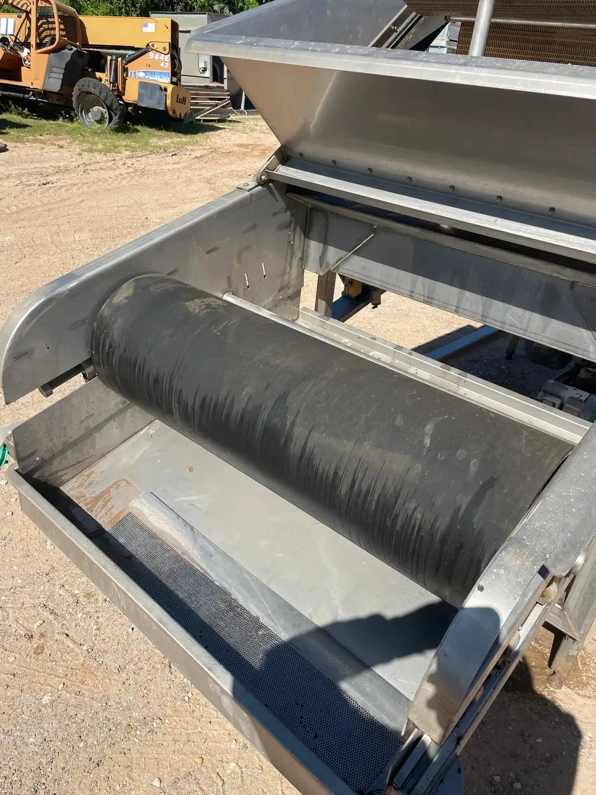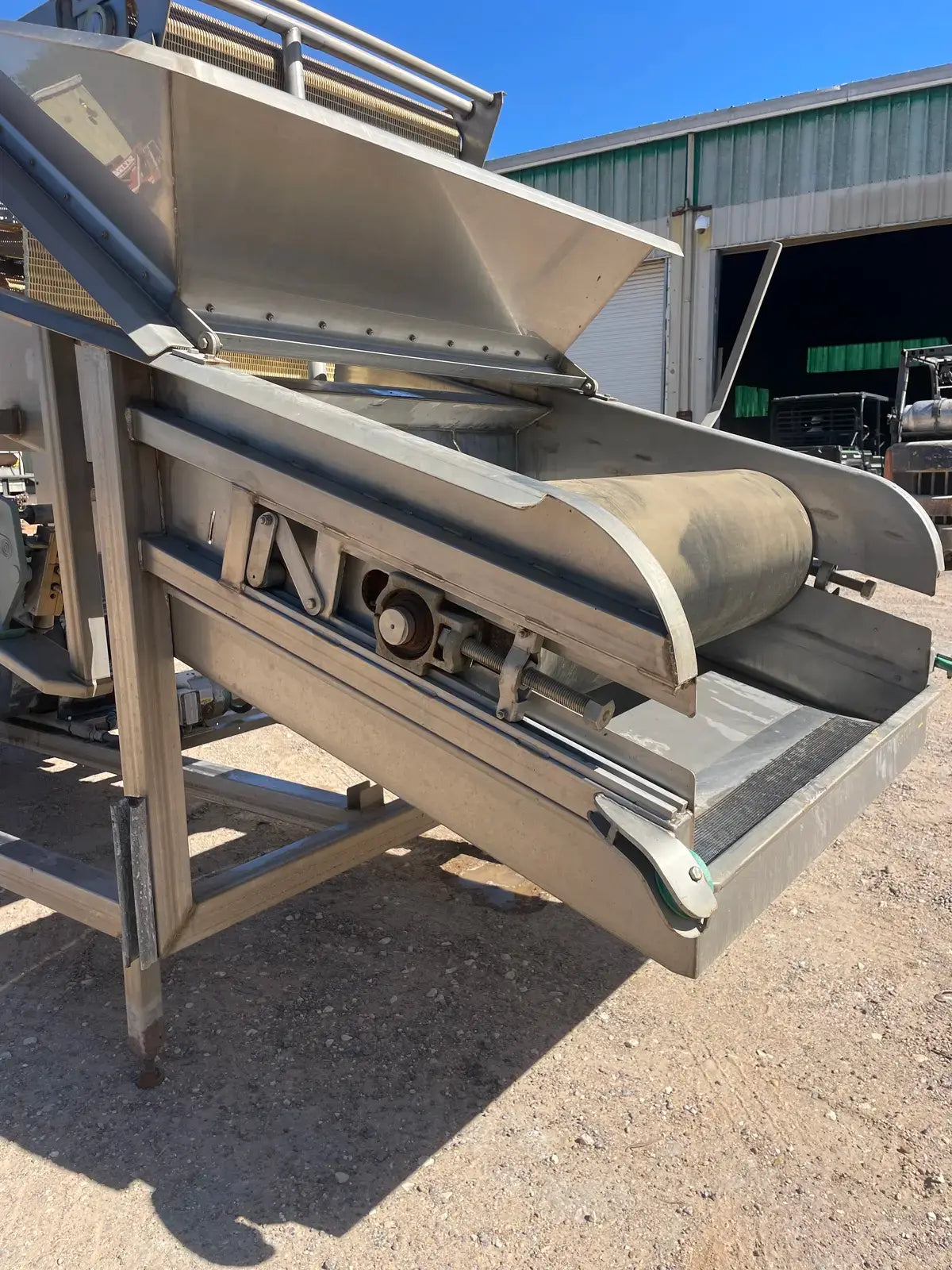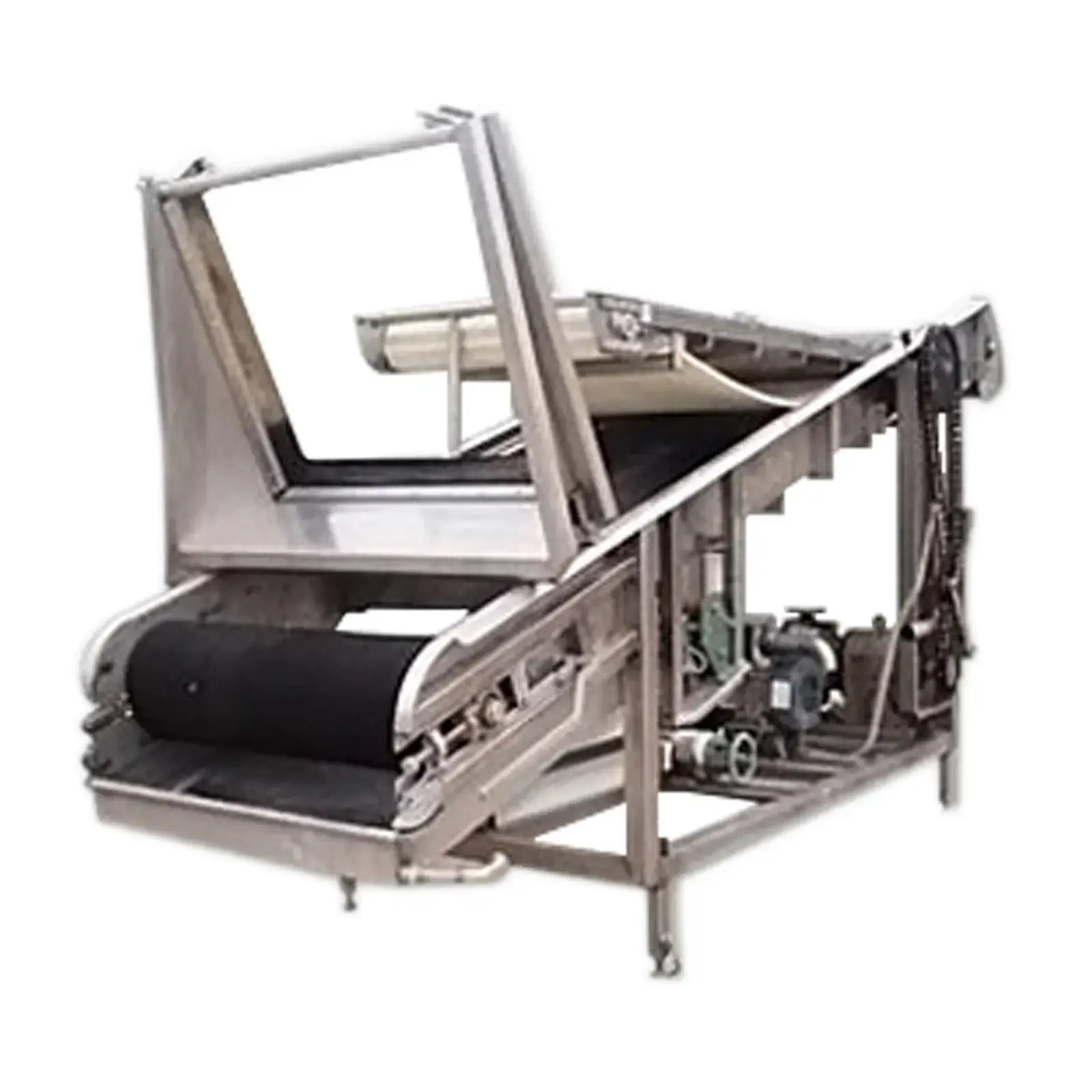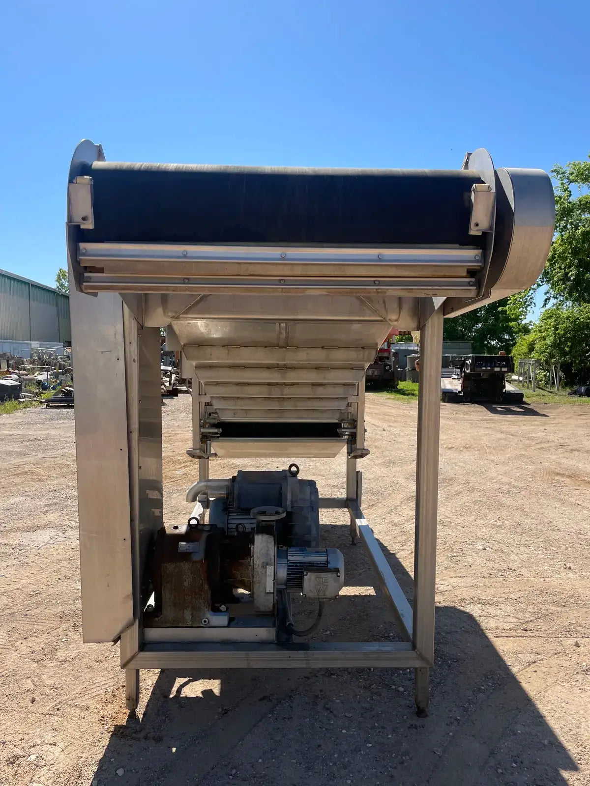 LUX Stainless Steel Vacuum Belt Dryer. Infeed hopper dimensions: 3 ft. 1 in. W x 3 ft. 10 in. L. Conveyor belt dimensions: 6 ft. 7 in. L x 3 ft. W. (2) Barrel dimensions: 13 in. dia. x 3 ft. L. EG&G Blower, P/N: 6-353042-40. Motor, 10 hp, 3500 rpm, 200-230/460V, 30-26/13 amps, 60 Hz, 3 phase. Sew-Eurodrive Motor, 4 hp, 2025 rpm, 230/460 V, 13.6/4.8 amps, 60 Hz, 3 phase. Sew-Eurodrive Variable Speed Gear Reducer, ratio: 69.84, rpm out: 28. Conveyor infeed height: 3 ft. 7 in. Conveyor exit height: 7 ft. 2 in. Inlets/outlets: (2) 1-1/2 in. dia. S-line fittings (washer fluid). Overall dimensions: 13 ft. 8 in. L x 5 ft. 2 in. W x 7 ft. 4 in. H.