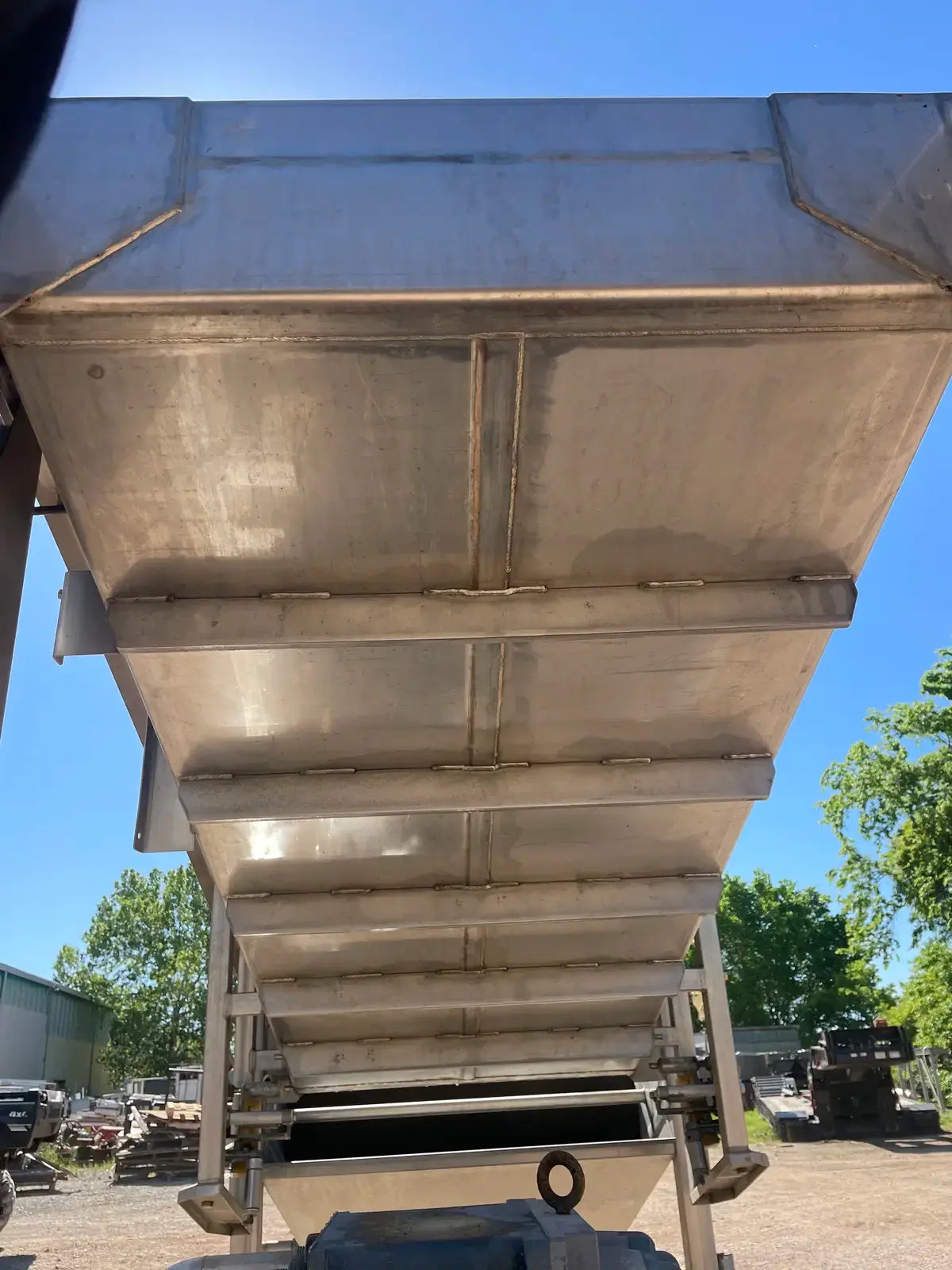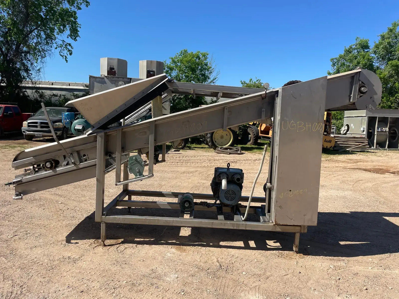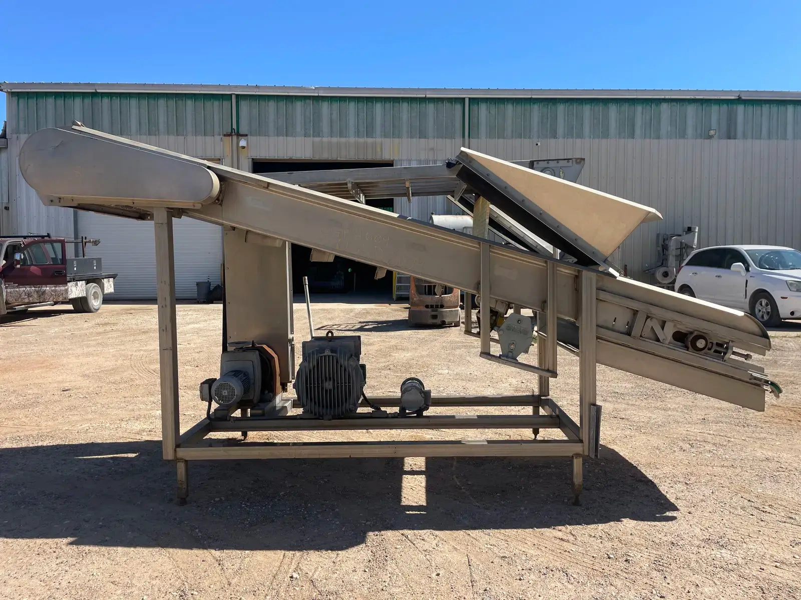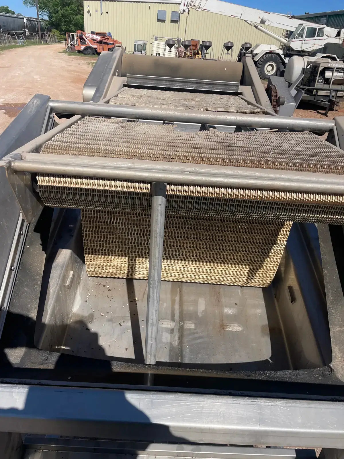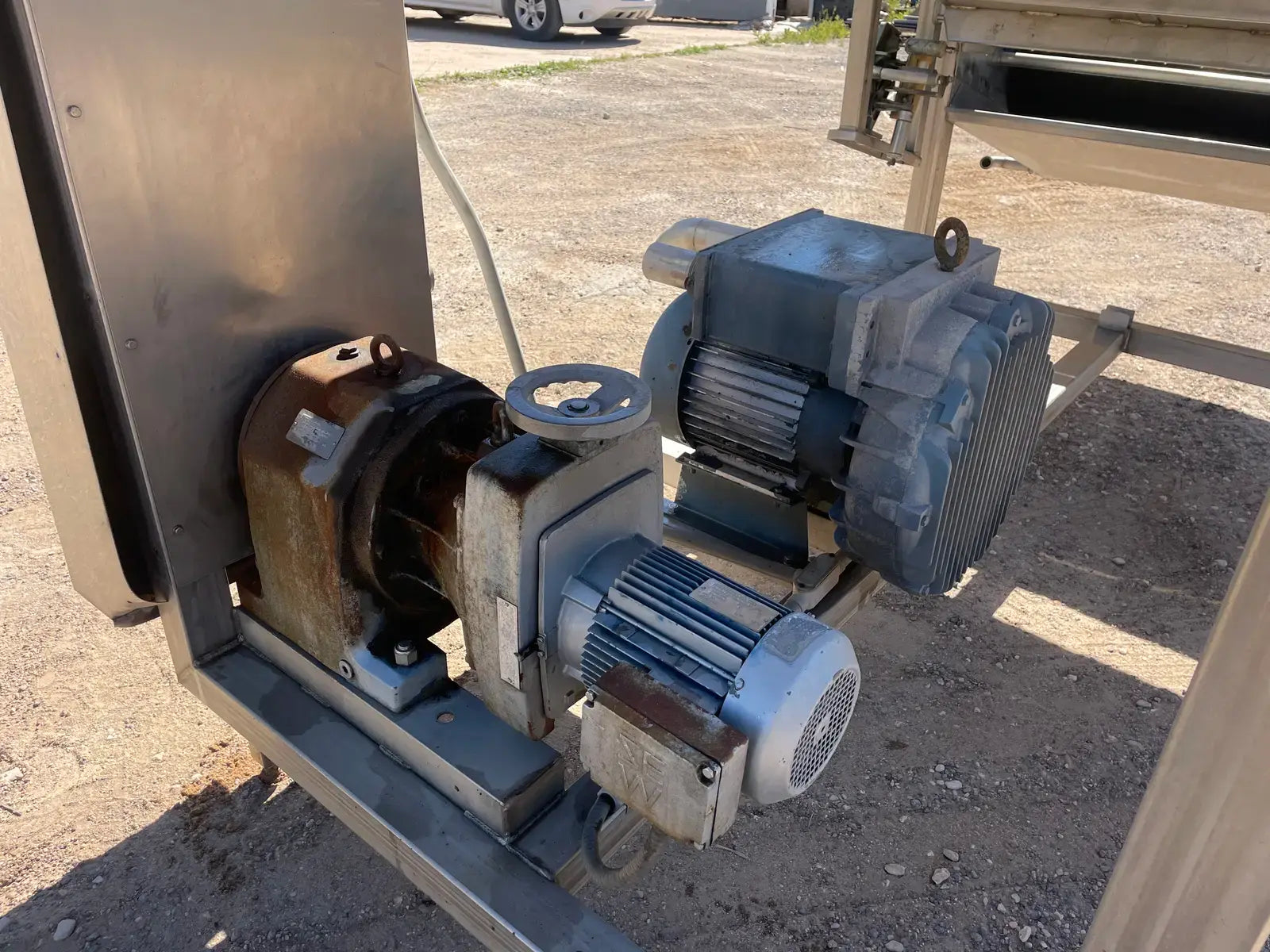 LUX Stainless Steel Vacuum Belt Dryer. Infeed hopper dimensions: 3 ft. 1 in. W x 3 ft. 10 in. L. Conveyor belt dimensions: 6 ft. 7 in. L x 3 ft. W. (2) Barrel dimensions: 13 in. dia. x 3 ft. L. EG&G Blower, P/N: 6-353042-40. Motor, 10 hp, 3500 rpm, 200-230/460V, 30-26/13 amps, 60 Hz, 3 phase. Sew-Eurodrive Motor, 4 hp, 2025 rpm, 230/460 V, 13.6/4.8 amps, 60 Hz, 3 phase. Sew-Eurodrive Variable Speed Gear Reducer, ratio: 69.84, rpm out: 28. Conveyor infeed height: 3 ft. 7 in. Conveyor exit height: 7 ft. 2 in. Inlets/outlets: (2) 1-1/2 in. dia. S-line fittings (washer fluid). Overall dimensions: 13 ft. 8 in. L x 5 ft. 2 in. W x 7 ft. 4 in. H.