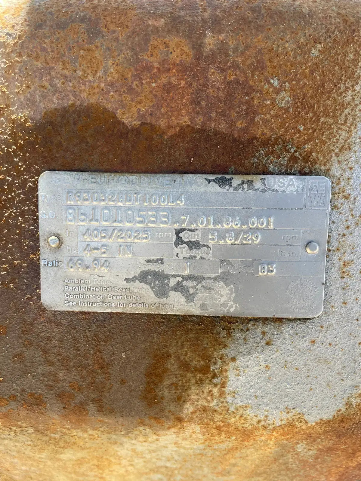 - If Multiple Motors, Motor Descriptions vs specs: (1) 10 hp Motor and (1) 4 hp SEW Eurodrive Motor
