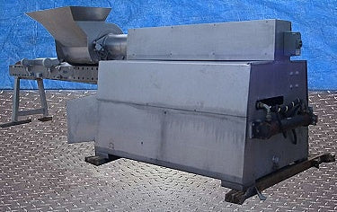 1999 Machinefabriek Amersfoort B.V. Hydrau Separator-Deboner. Model: HS250-AUT GT. S/N: 5126. Capacity per cycle: approx. 40 lbs. bones. Cycle time: 30 sec. at a dwell-time of 10 sec. Infeed hopper dimensions: 47-1/2 in. L x 29 in. W. Electrical requirements: 75 hp, 460 V, 60 Hz, 3 phase. Rotor Motor, 52 hp, 1775 rpm, 460 V, 78.9 amps, 60 Hz, 3 phase. The separator has been designed to meet the demand for maximum profitability in the handling of all bones in respect to removing residual meat for addition to formulated meat products. Bones placed in the machine are subjected to an overpressure of 2800-3500 psi at which point the residual meat becomes a fluid and is forced from the separation chamber. By virtue of this process the bones are not crushed or severely broken. The resultant meat paste has been found to be free from bone fragments and splinters. The HS 250 has been designed with a minimum of moving parts to minimize service and optimize cleaning. Inlets: (1) 32 in. L x 22 in. W infeed hopper. Outlets: (1) 10 in. dia. x 11-1/2 in. L discharge. Overall dimensions: 20 ft. 1 in. L x 59 in. W x 80 in. H.