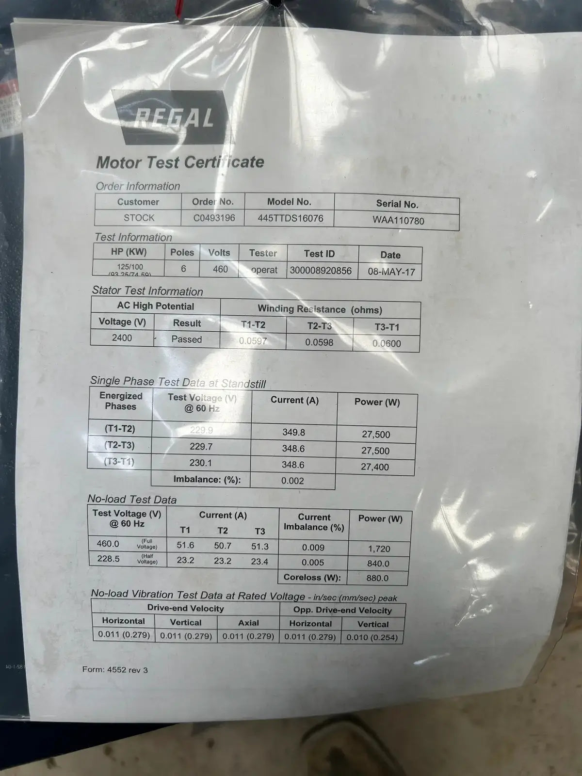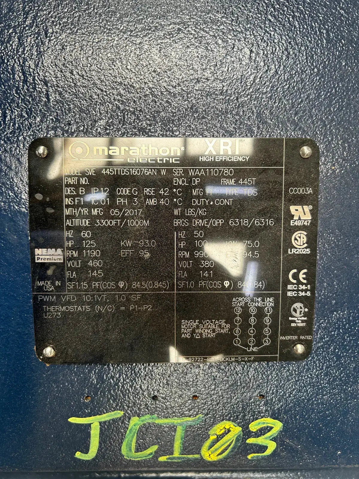 Marathon Electric Motor XRI High Efficiency. Model: 445TTDS16076AN. Serial No: WAA110780. Type: TDS. Frame: 445T. Power Supply - Hp: 125, Hz: 60, Rpm: 1190, Volt: 460, FLA: 145, Ph: 3.