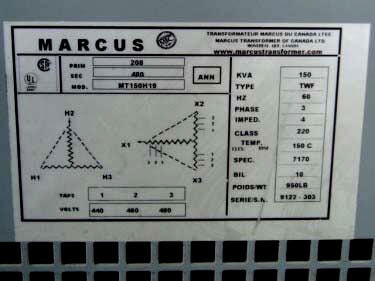 Marcus Homogenizer Transformer- 150 KVA. Model: MT150H19, S/N: 9122-303. Primary voltage: 208. Secondary voltage: 480. Taps/volts: 1/440, 2/460, 3/480. Type: TWF, Hz: 60, phase: 3, impedance: 4, class: 220, Temp: 302°F. Overall dimensions: 31 in. L x 21 in. W x 38 in. H.(H17).