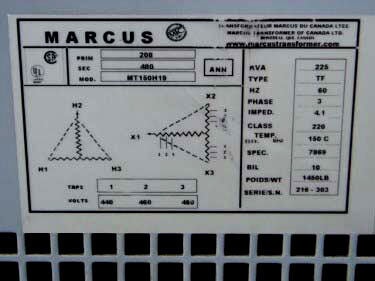 Marcus Homogenizer Transformer- 225 KVA. Model: MT226 H19, S/N: 216-303. Primary voltage: 208. Secondary voltage: 480. Taps/volts: 1/440, 2/460, 3/480. Type: TF, Hz: 60, phase: 3, impedance: 41, class: 220, temp: 302°F, spec: 7809. Overall dimensions: 35 in. L x 25 in. W x 47 in. H.(H17).