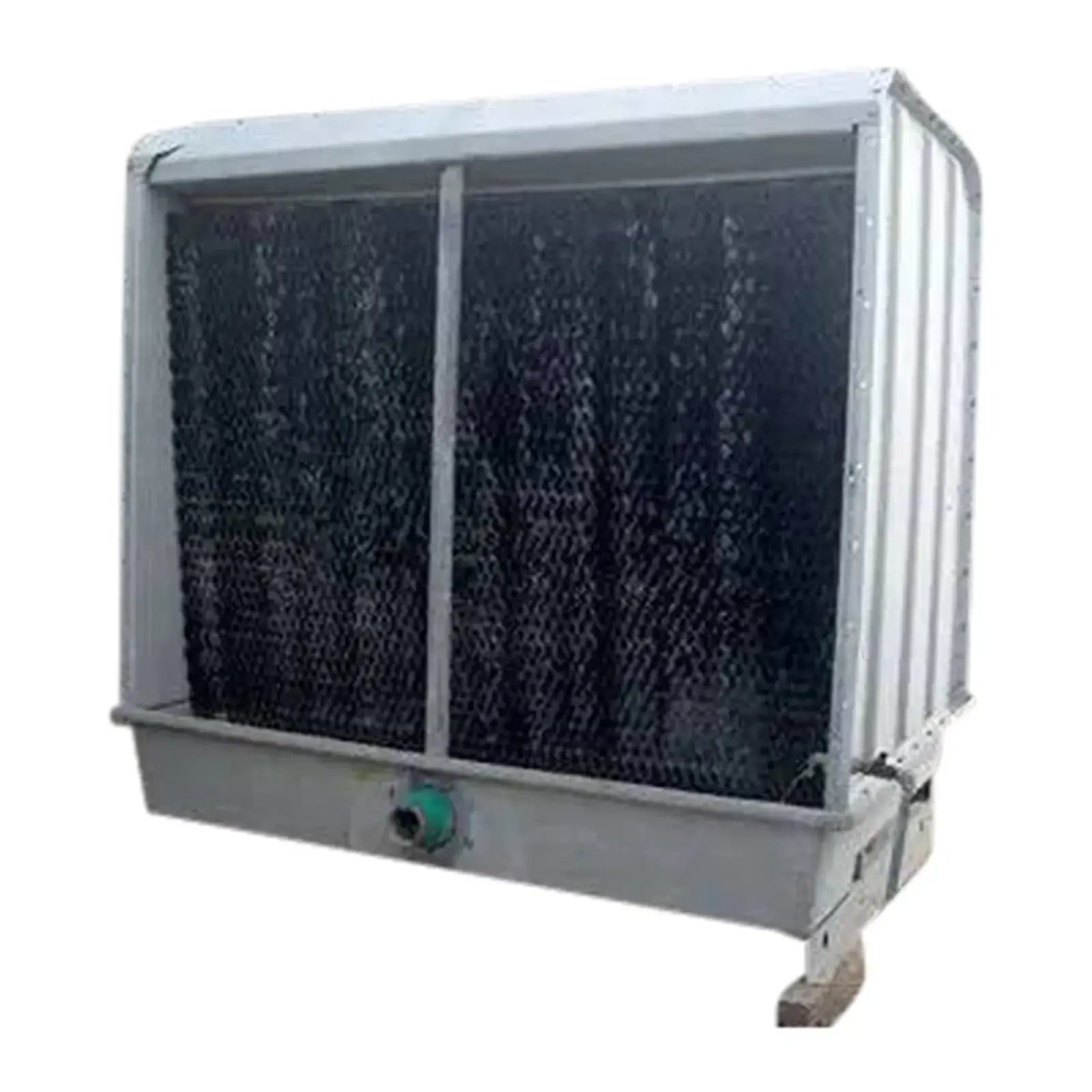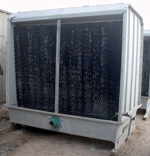 Marley Cooling Tower. Model: Aquatower. Capacity: 80 tons. S/N: 208230-861-B24538-01. Belt size: B-140. Fan diameter: 4 ft. 5 in. Marathon Electric Motor. Motor pulley diameter: 6 in. Fan pulley diameter: 20-1/2 in. Pulley ratio: 0.29. All primary components of the Aquatower are open to view and debris can be easily removed from the upper basin or nozzles while the tower is in operation. V-belts are easily replaced and aligned from outside the tower. Aquatowers perform as specified in the heat of summer, respond well to energy management techniques in the spring and fall and with appropriate fan controls, can operate virtually ice-free throughout winter months. Inlets: (1) 3/4 in. dia. makeup valve, (1) 9 in. dia. water infeed port. Outlets: (1) 4 in. dia. drain port, (1) 1-1/2 in. dia. overflow port. Overall dimensions: 8 ft. 7-1/2 in. L x 7 ft. W x 9 ft. 2 in. H. (ACN171).