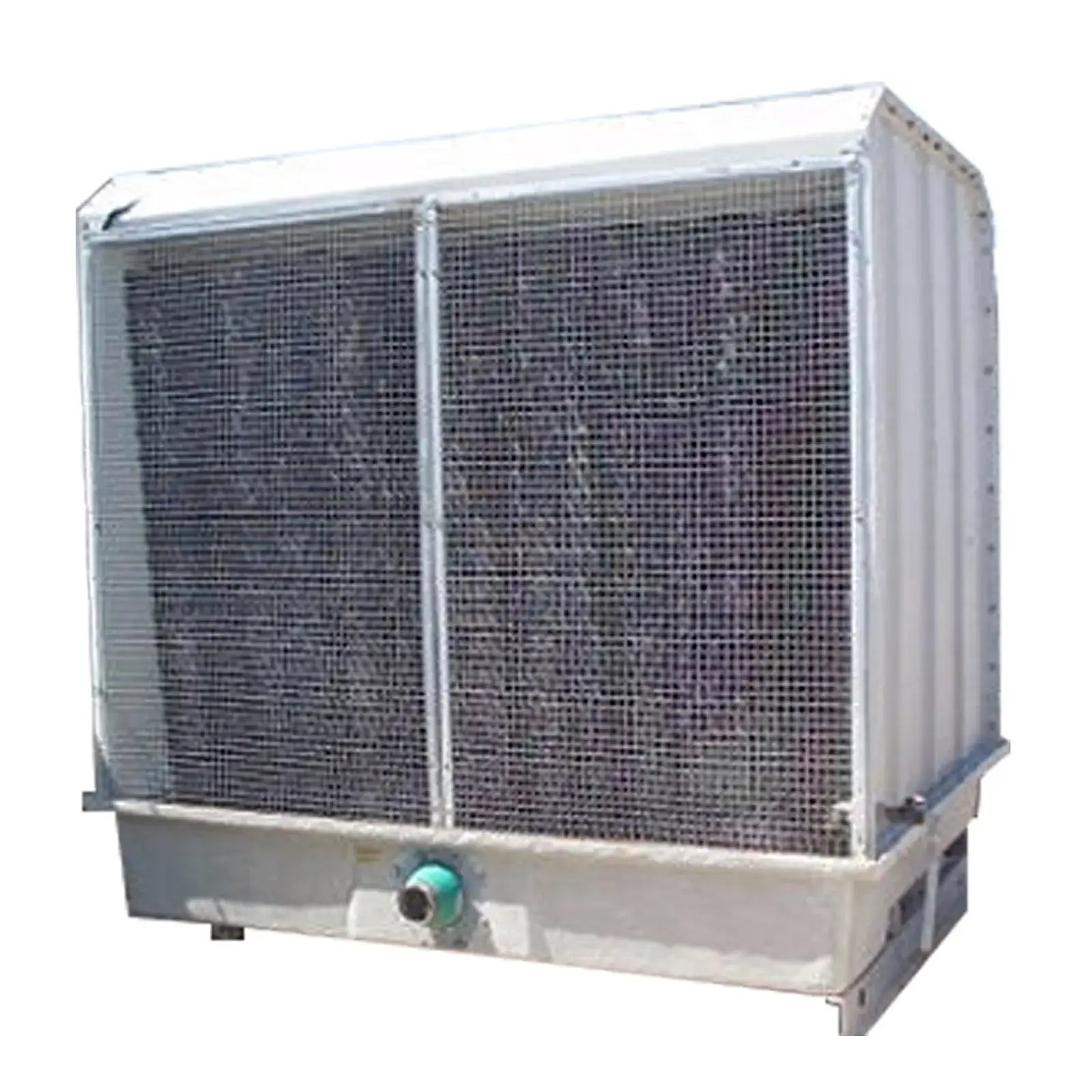Marley Cooling Tower. Model: Aquatower. Rated capacity: 80 tons. Belt size: B-140. Fan diameter: 4 ft. 5 in. Marathon Electric Motors, 5 and 3 hp. All primary components of the Aquatower are open to view and debris can be easily removed from the upper basin or nozzles while the tower is in operation. V-belts are easily replaced and aligned from outside the tower. Aquatowers perform as specified in the heat of summer, respond well to energy management techniques in the spring and fall and with appropriate fan controls, can operate virtually ice-free throughout winter months. Overall dimensions: 8 ft. 7-1/2 in. L x 7 ft. W x 9 ft. 2 in. H.