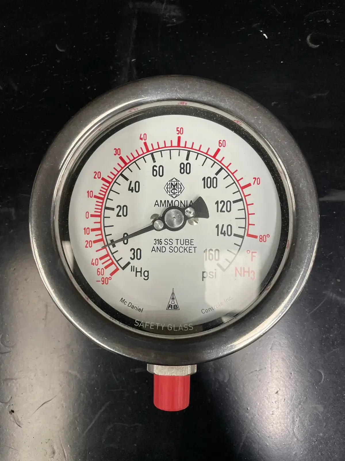 Unused McDaniel Controls ammonia pressure gauge. Range: -30 - 160 psi. Connection: 1/4 NPT.