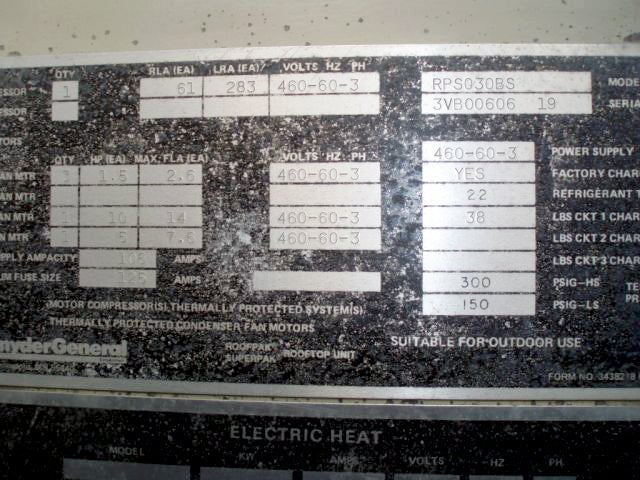McQuay Roof Mounted Air Conditioner. Model: RPS030BS. Nominal capacity: 30 tons. Heating type: Steam. (3) Condenser fan motors, 1.5 hp, 2.6 maximum FLA, 460 V, 60 Hz, 3 phase. (1) Evaporator fan motor, 10 hp, 14 maximum FLA, 460 V, 60 Hz, 3 phase. (1) Fan motor, 5 hp, 7.6 maximum FLA, 460 V, 60Hz, 3 phase. Minimum supply amp capacity: 106 amps. Maximum fuse size: 125 amps. Power supply: 460-603. Refrigerant: R22. CKT charge: 38 lbs. Test pressure: 300 psi high side, 150 psi low side. Fins per inch: 8. Copelametric motor, Model: 6RK2-3500-TSK, B/M: 240, 3 phase. Overall dimensions: 20 ft. 1-1/2 in. L x 7 ft. 10 in. W x 4 ft. 4 in. H.