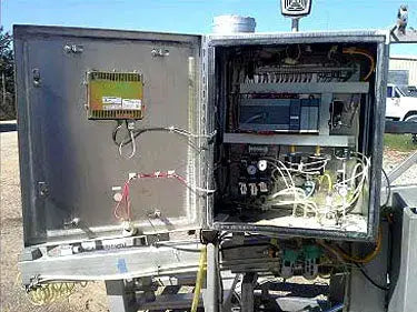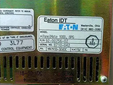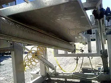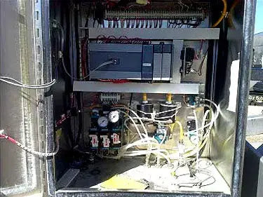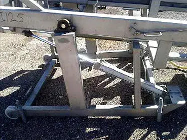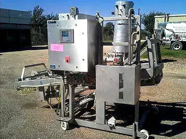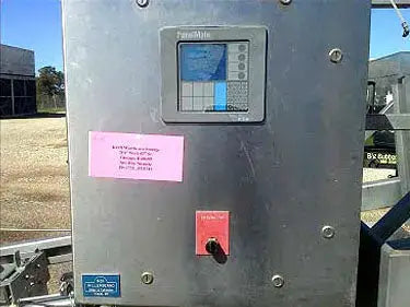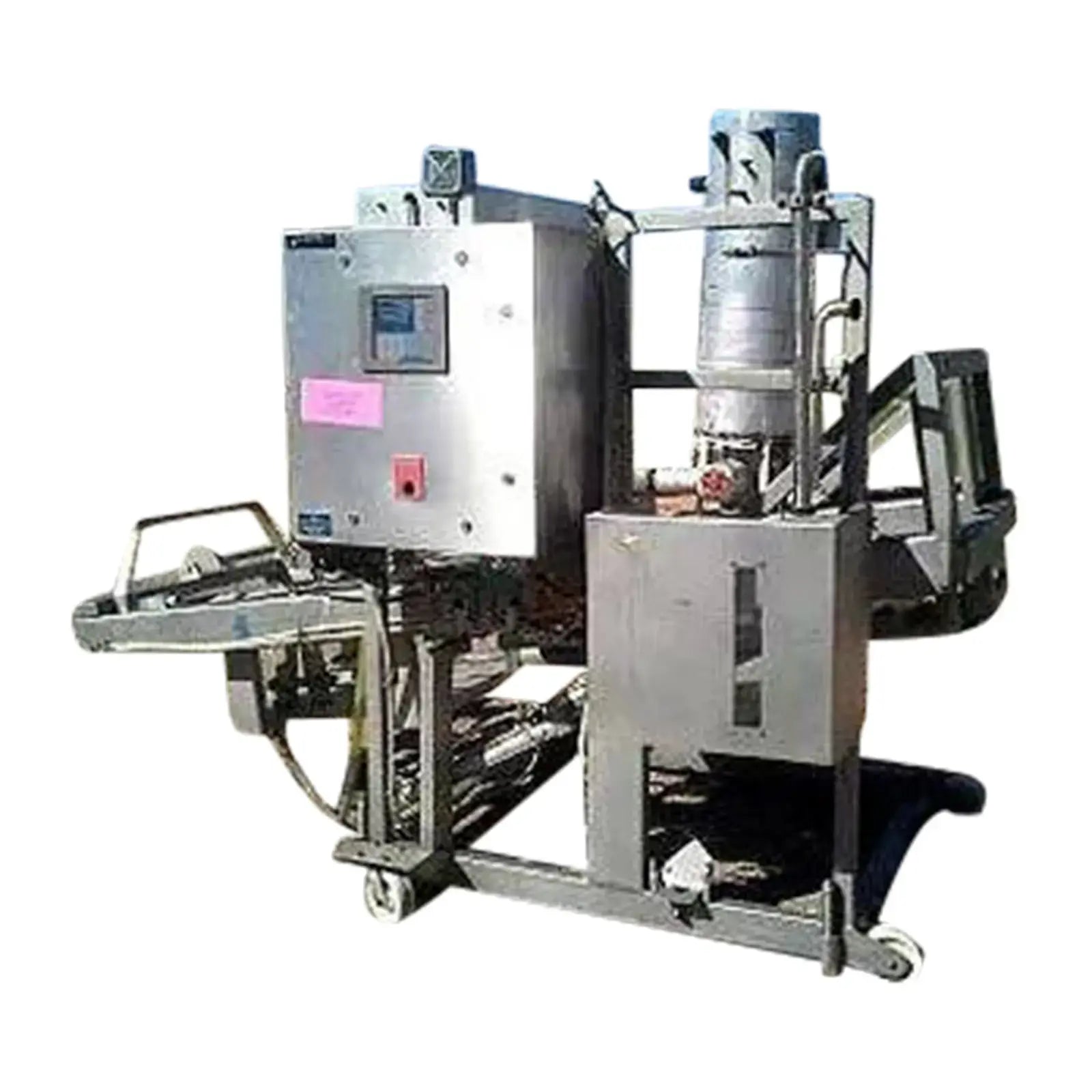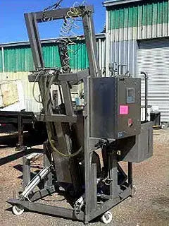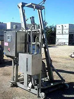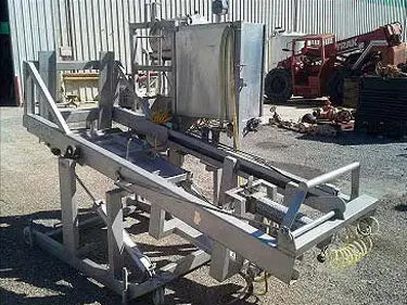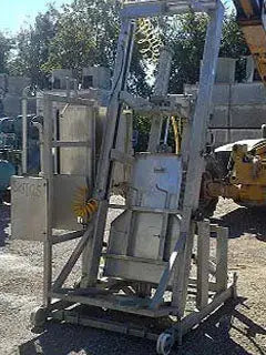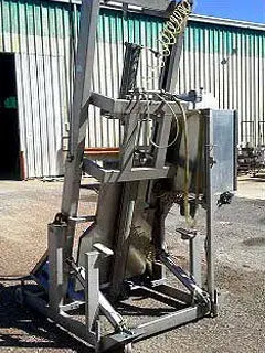 Stainless Steel Tote / Drum Dumper manufactured by MDF Millerbernd Design & Fabrication, Winsted, MN. Stainless steel control box with Eaton IDT PanelMate 1000, 8PG. S/N 8710-042. C&C Manufacturing, Inc. pneumatic piston. Unit is air operated with electronic controls (110V, 60 Hz, 1-phase).