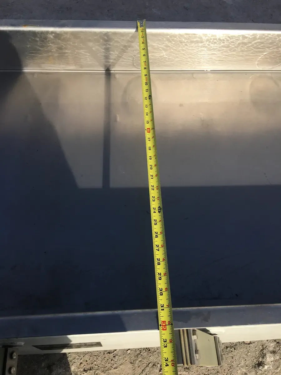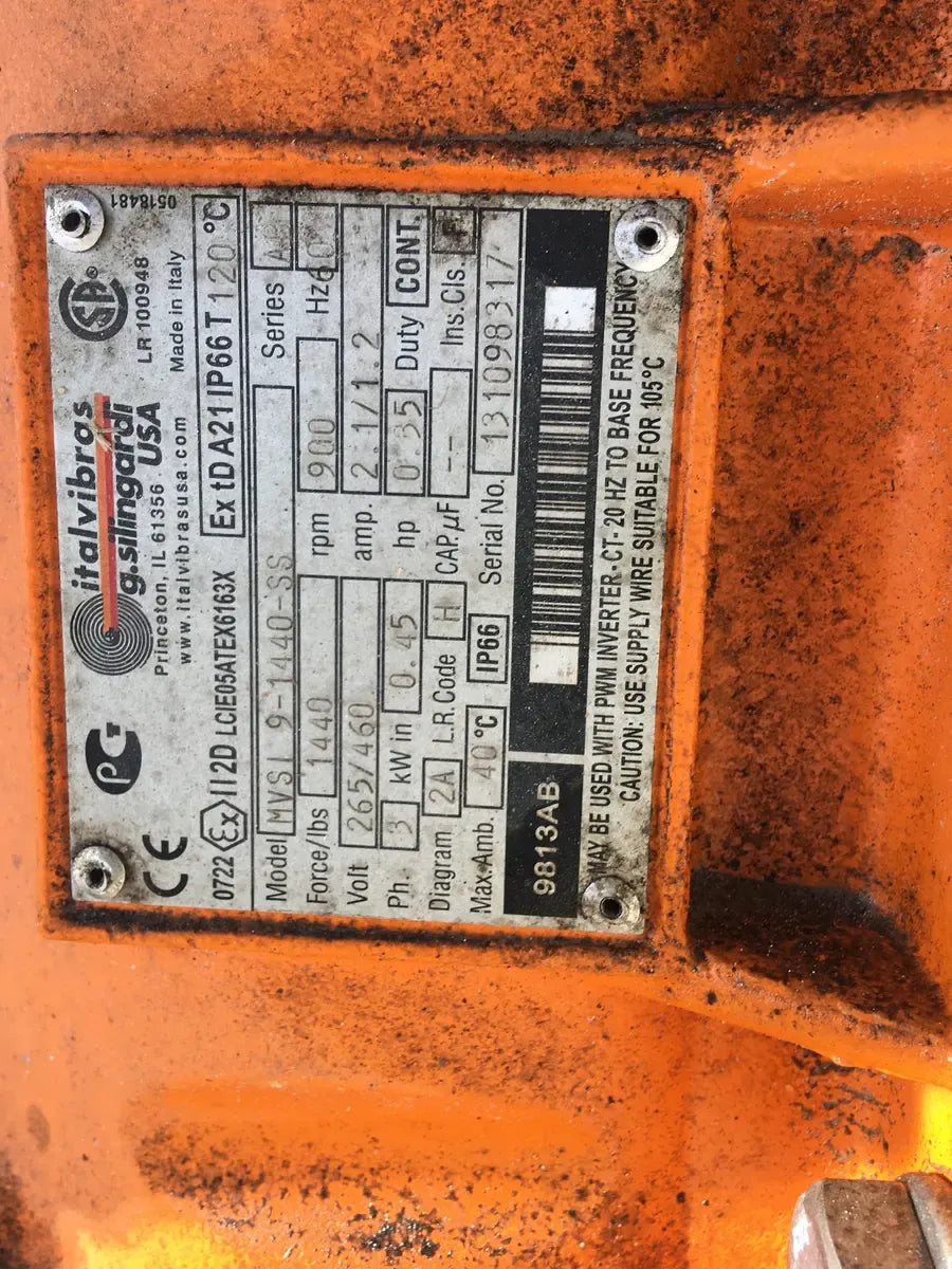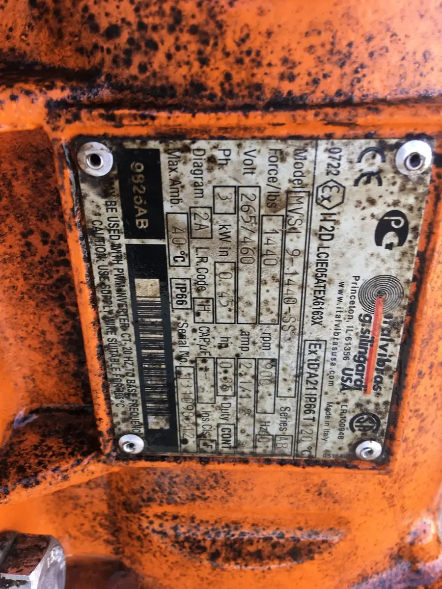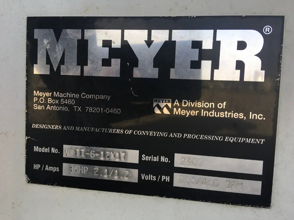 Meyer 17' Long Shaker Conveyor. Shaker pan is 17'L x 29W with 6 sidewalls. Dual .35hp shaker motor assemblies. With two sets of 37H x 6x6 legs to raise conveyor elevation. OD = 17'1 x 53W x 28H. Meyer Shaker Conveyor: Model No: VFII-6-12X17, Serial No: 2569, Hp:.35, Amps: 2.1/1.2, Volts 265/460, Ph: 3