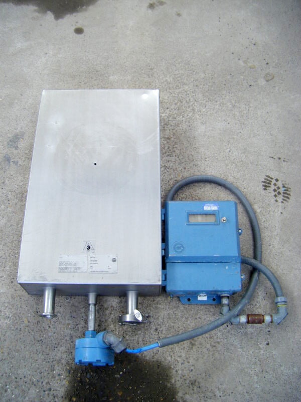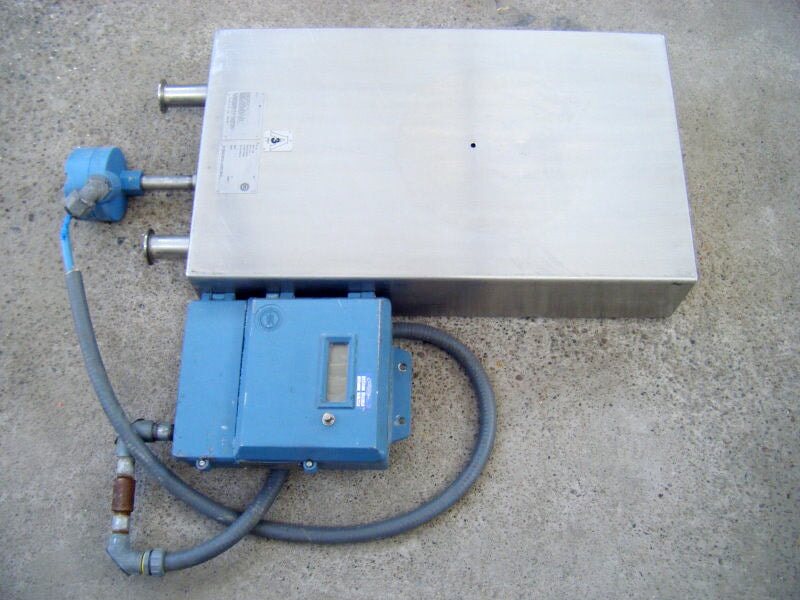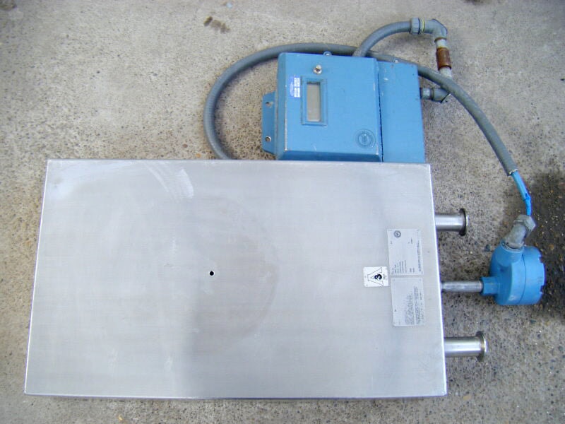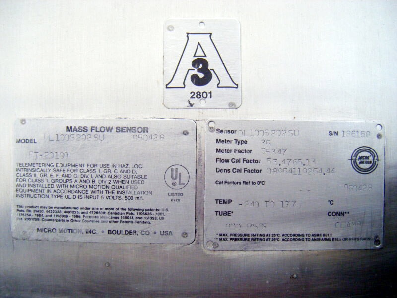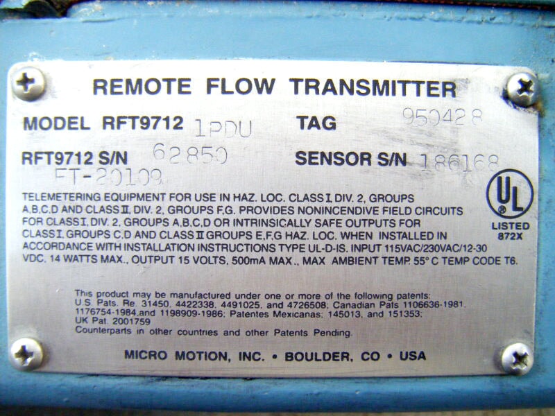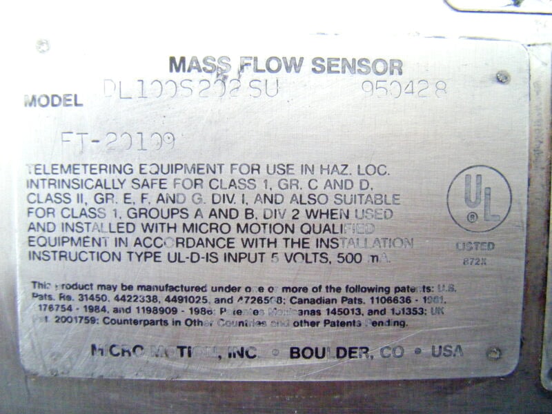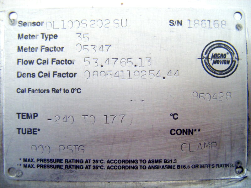 Micro Motion Mass Flow Sensor. Model no. DL100S202SU. Serial no. 186168. (1) 1 in. s-line inlet. (1) 1 in. s-line outlet. Temperature -240 to 177. 900 PSIG. Overall dimensions for Flow Sensor: 2 ft. 9-1/8 L. x 1 ft. 3 in. W. x 5-1/4 in. H. Remote Flow Transmitter. Serial no. 62850. Frequency output: 6000 Hz =60 Gal/min. Overall dimensions for Remote Flow Transmitter: 1 ft. L. x 9 in. W. x 4-1/4 in. H. (IN-TX).