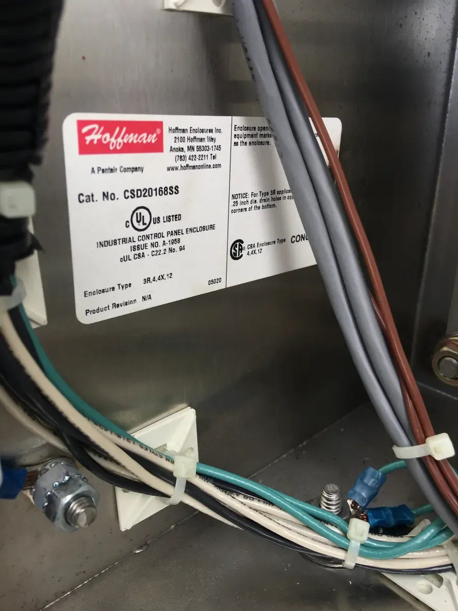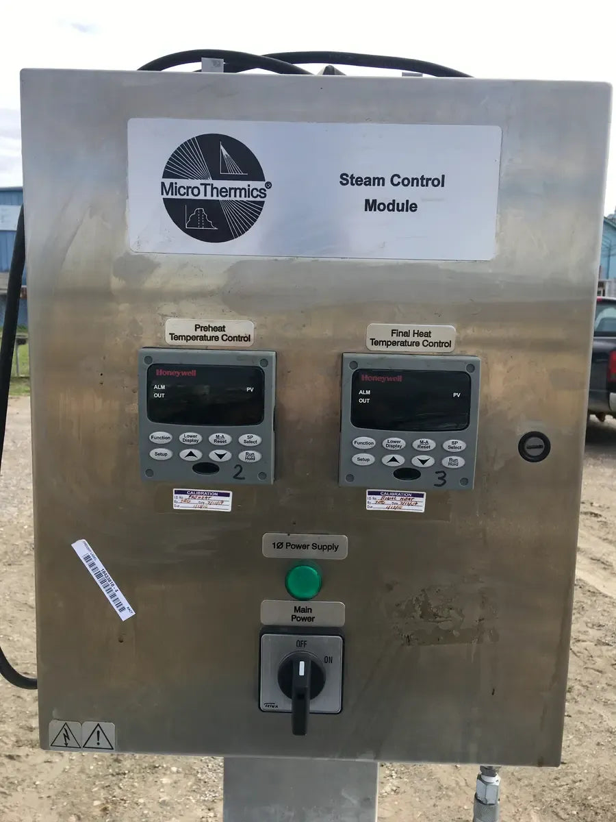 Microthermics Direct Steam UHT/HTST Lab Pasteurizer Electrix Series. Serial No: 3216316.5, Power Usage: Volts: 110, AMPS: 0.2, Hz: 60. These UHT/HTST Proccessers are ideal for researchers and labs that have steam, and need maximum flexibility for product and process capabilties. Hoffman Industrial Control Panel Enclosure: Cat No. CSD20168SS. Industrial Control Panel Enclosure: Issue No A-1958, Enclosure Type : 3R,4,4X,12. Electric Controller: Serial N0: 0446Y464872700002, Mac Address: 90-250 Vac, 50/60 HZ, 18VA, Ambient Limits: 0-55 Deg.C.