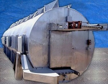 Morris & Associates IQF Freezer. Stainless steel. Model: CBF-20T-248-32. Continuous 24 in. stainless steel belt; 8 passes, 3,000 lbs peas/hr. Belt height clearance: 3 in. Number of fans: 8. Fan motor HP: 1. Freon evaporator coil holding pressure. Overall dimensions: 34 ft. L x 7-1/2 ft. W x 9 ft. H.(HB2).