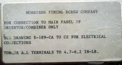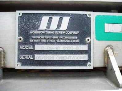 Morrison Container Handling Solutions Bottle Conveyor System. Model: C-09-10-12120-001. S/N: 95/12120 ORIENT/COMB. Maximum bottle size: 3 in. dia. x 6-1/2 in. H. Timing screw dimensions: (1) 5 in. dia. x 3 ft. 6 in. L, (4) 6 in. dia. x 3 ft. L, (1) 5 in. dia. x 2 ft. 7 in. L. Reliance Electric Motor, 2 hp, 1725 rpm, 208-230/460 V, 6.4-8.4/13.2 amps, 60 Hz, 3 phase. Morse Torq Gard Speed Reducer, 680 rpm (final). Reliance Electric Motor, 3/4 hp, 1725 rpm, 208-230/460 V, 2.2-2.2/1.1 amps, 60 Hz, 3 phase. Winsmith Speed Reducer, 30 ratio, 58.3 rpm (final). Reliance Electric Motor, 1 hp, 1725 rpm, 208-230/460 V, 2.8-2.8/1.4 amps, 60 Hz, 3 phase. Winsmith Speed Reducer, 30 ratio, 58.3 rpm (final). (2) Bodine Electric Gear motor, 1/4 hp, 62 rpm (final), 130 V, 1.8 amps, 40 ratio. (2) Hub City Gear Drives. Gast Vacuum Pump, Model: 0765-V6A. Baldor Industrial Motor, 0.33 hp, 1725 rpm, 208-230/460 V, 1.8-1.6/0.8 amps, 60 Hz, 3 phase. Conveyor infeed/exit height: 42 in. Overall dimensions: 10 ft. 5 in. L x 5 ft. 4 in. W x 5 ft. 10 in. H. (XMR33a)