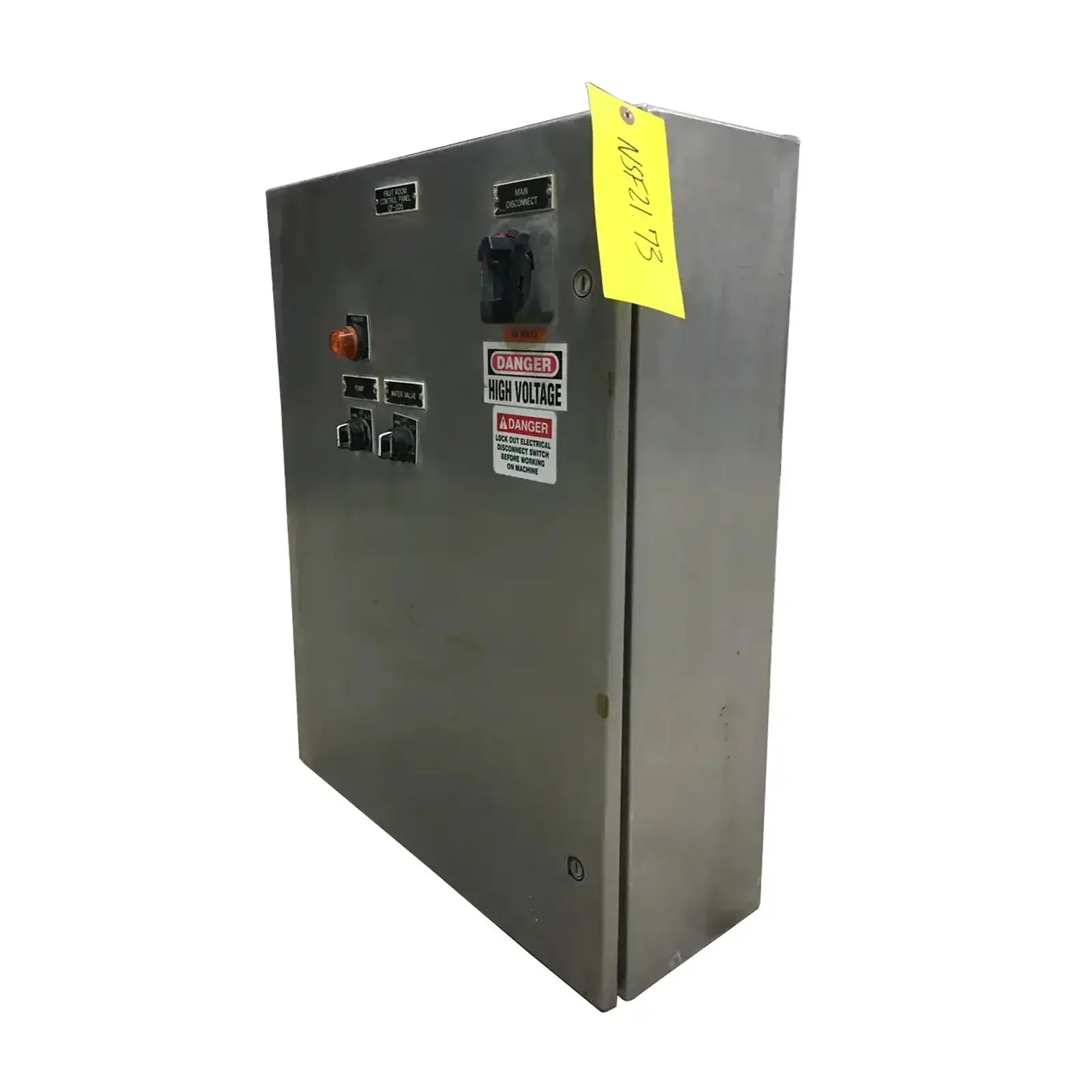 Stainless 480V Control Panel CP-205. Control Panel Was Used In a Fruit Room to Power Pumps & Water Valve. Has Three Switchs For Pump and Water Valve and Main Disconnect.