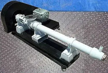 Moyno 6M4 Progressing Cavity Pump. Type: SDR. Model: 6M4. S/N: AS53673. Maximum rpm: 1050. Displacement per Revolution: 0.006 gal. Motor: 10 hp, 1735 rpm, 230/460 V, 27/13.5 amps, 3 phase. Pulley ratio: 3 to 1. Current final rpm: 578. The Moyno progressing cavity pump is a single screw rotary pump. The pumping action is created by the single helical rotor rolling eccentrically in the double threaded helix of the stator. Typical applications include high-pressure water, pastes & gels, food, wastes & by-products, chemical feed & sampling, and coolants & lubricants. Inlet: (1) 3 in. diameter, flange: 7 ½ in. diameter with (4) holes, center to center: 6 in. Outlet: 2 ½ in. threaded female. Overall dimensions: 6 ft. 3 in. L x 3 ft. 6 in. W x 2 ft. 2 in. H. (ACN74).