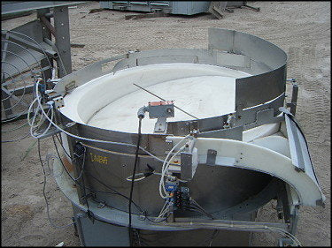 M&S Centrifugal Bowl Feeder. This centrifugal feeder has two motors one for driving the rim and the other for driving the center disc independently. (1) Baldor electric motor, ¾ hp, 1725 rpm, 208-230/460 V, 3.2-3.0/1.5 amps, 60 Hz, 3 phase. (1) Reliance electric motor, ½ hp, 1725 rpm, 208-230/460 V, 1.5-1.5/0.75 amps, 60 Hz, 3 phase. Bowl bottom is incline. Bowl dimensions: 3 ft. 4 in. dia. x 6 ½ in deep at deepest point. Max. product dimensions: 3 ¼ in. x 3 ¼ in. W x 1 in H. Inlet: 3 ft. 4 in. dia. open top. Outlets: (2) 3 ½ in. x 7 in. discharge slots. Overall dimensions: 5 ft. 5 in. L x 5 ft. W x 3 ft. 7 in. H.(H17).