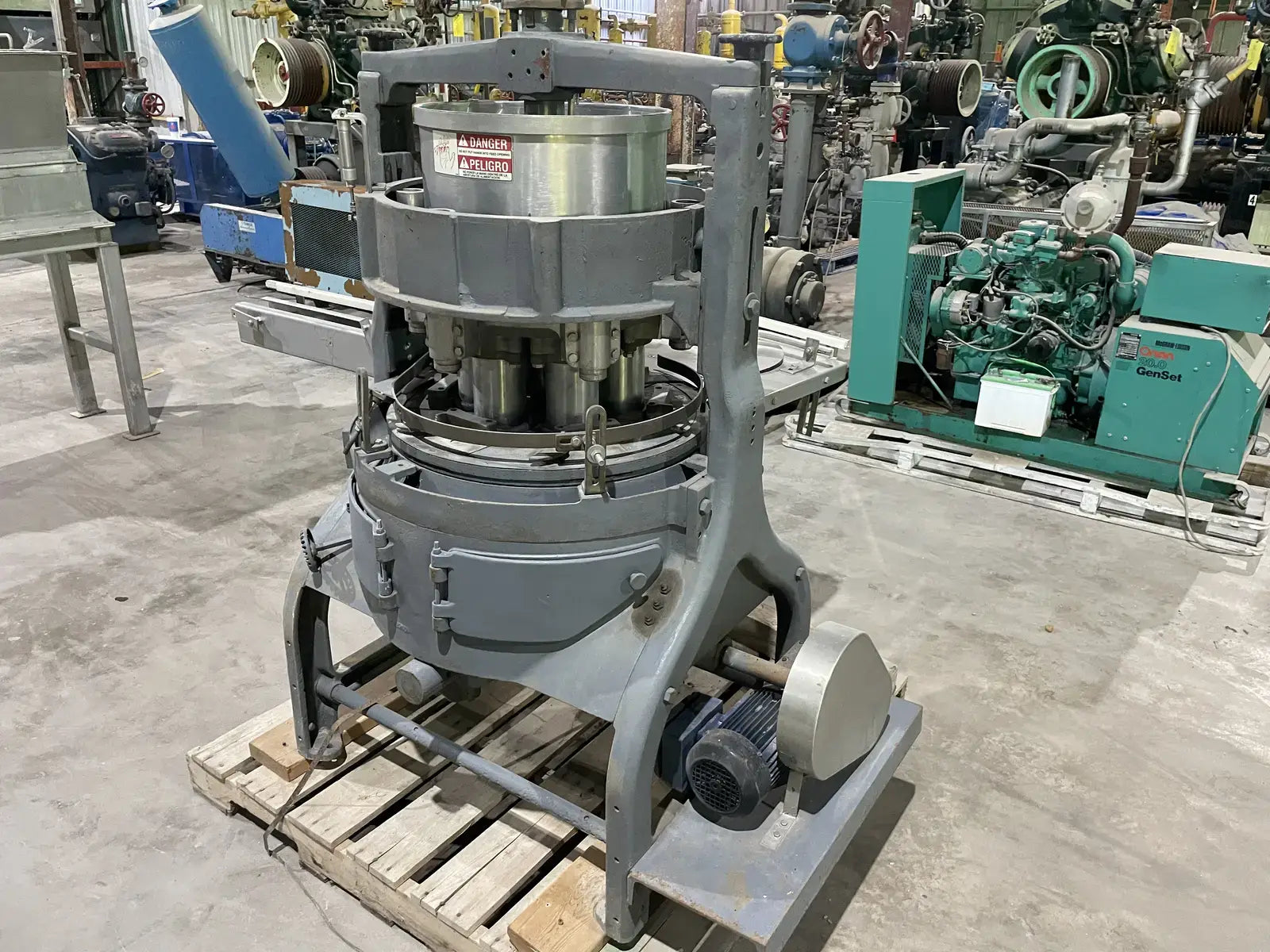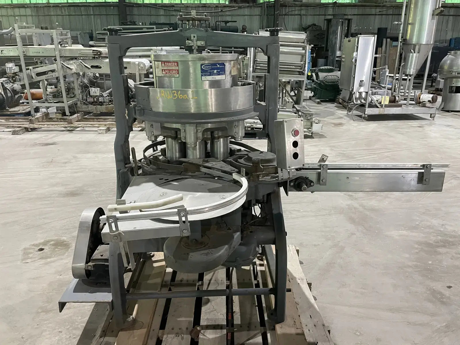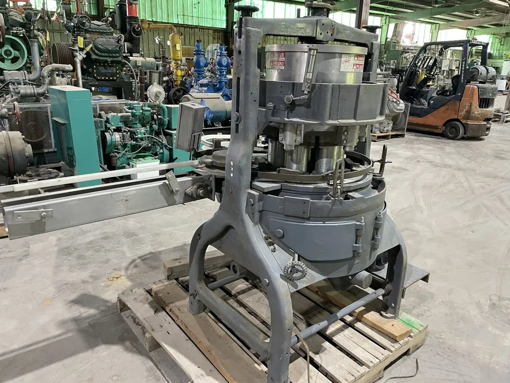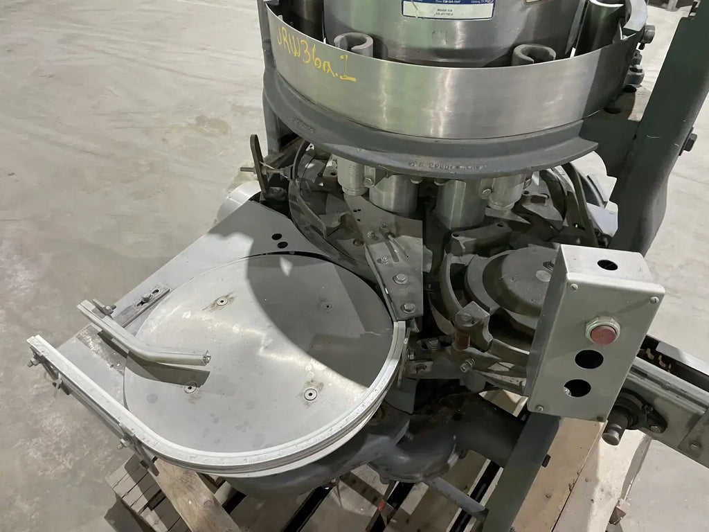 M&S FMC 6 Pocket Filler. Fills cans size: 3-3/4 in. x 2 in. x 3-1/4 in. or cans #1 and #2. Piston diameter: 3-1/8 in. Stroke: 4 in. Valve diameter: 1-1/2 in. Centers between valves: 9-3/4 in. Maximum fill volume: 0.5 liters. Tank volume: 16 in. x 10 in. (35 liters). Transmission: 1.5 hp., 220 V. Pneumatic piston to open and close valves (no bottle, no fill). Conveyor: 3-1/4 in. chain. Overall dimensions: 76 in. L x 48 in. W x 62 in. H.(H14)(XMR72)