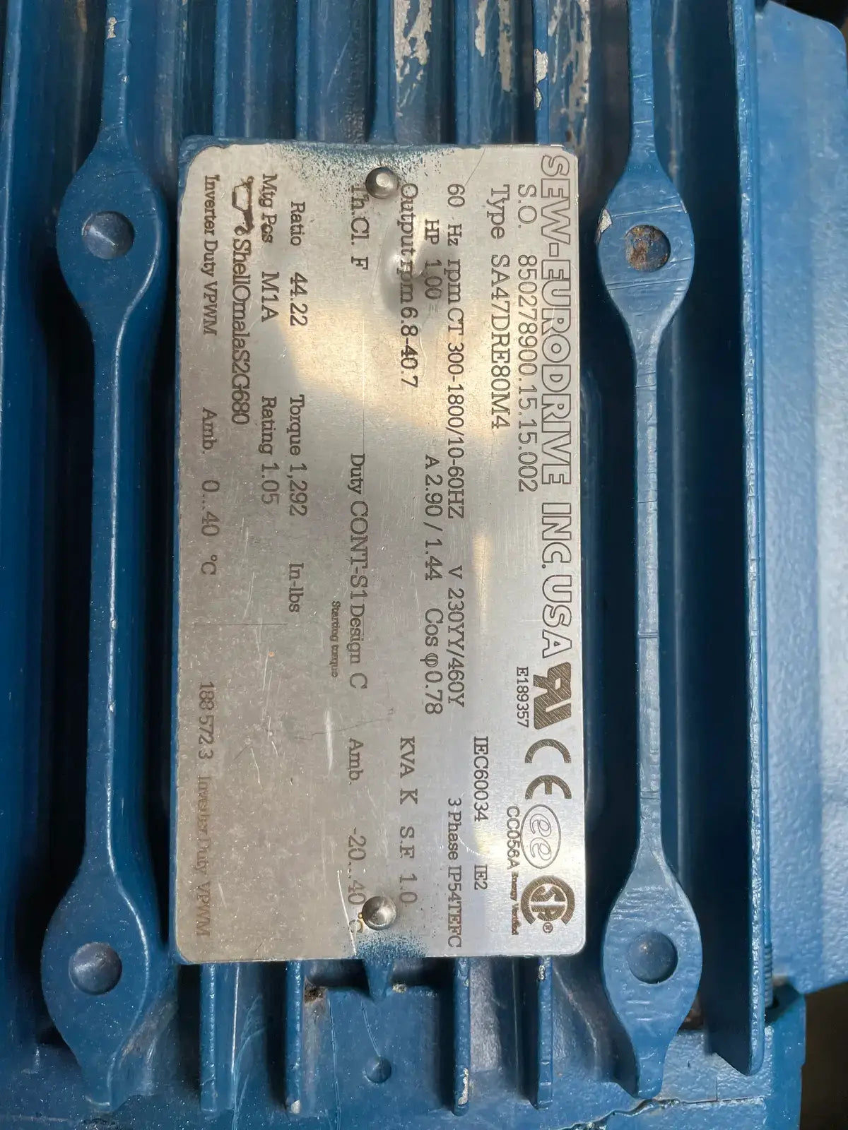 - If Multiple Motors, Motor Descriptions vs specs: Sew-Eurodrive: SA47DRE80M4. Input: 300-1800/10-60 HZ. Output: 6.8-40.7. HP: 1. Ratio: 44.22.