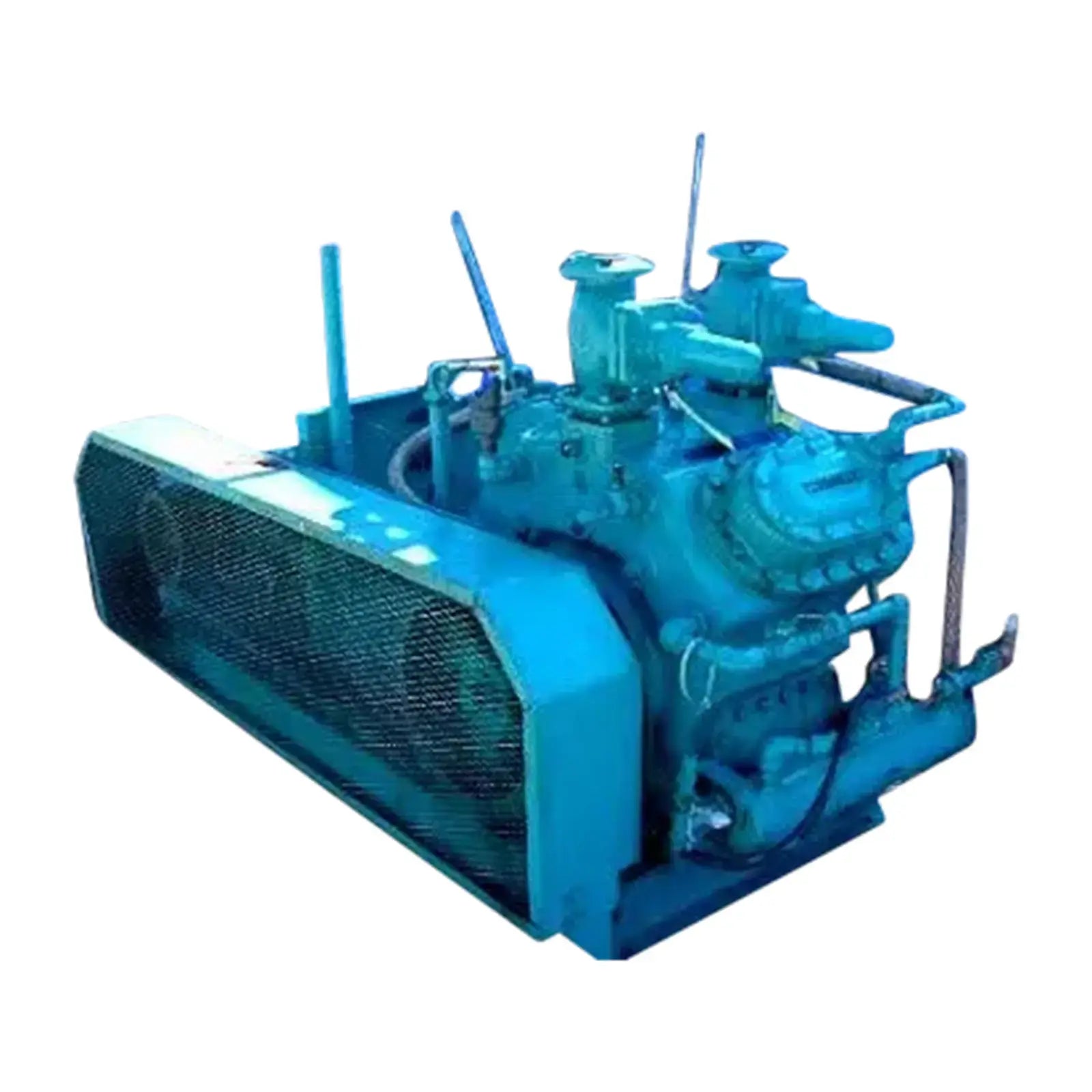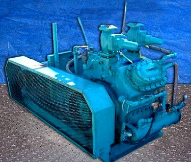 Mycom Cimco C5-WO4A 4-Cylinder Reciprocating Compressor. Model: C5-WO4A. This is the same compressor as the model N4A. Refrigerant: last used with R-717 (ammonia). Nominal capacity: 29.2 tons at 32.5 bhp with a 95ºF condensing temperature and 20ºF suction temperature. Displacement: 110 cfm. Max speed: 1,450 rpm. Bore: 3-3/4 in. Stroke: 3 in. Hydrostatic test pressure (hi/lo): 450/300 psig. Air test pressure (hi/lo): 300/180 psig. Water cooled oil heads and oil cooler. U. S. Electrical motor, 25 hp, 1775 rpm, 575 V, 24 amps, 60 Hz, 3 phase. Inlet: 2-1/4 in. dia. suction. Outlet: 2 in. dia. discharge. Approximate weight: 2,200 lbs. Overall dimensions 6 ft. 9 in. L x 3 ft. 2 in. W x 4 ft. 2 in. H. (ACN166-BC/M).