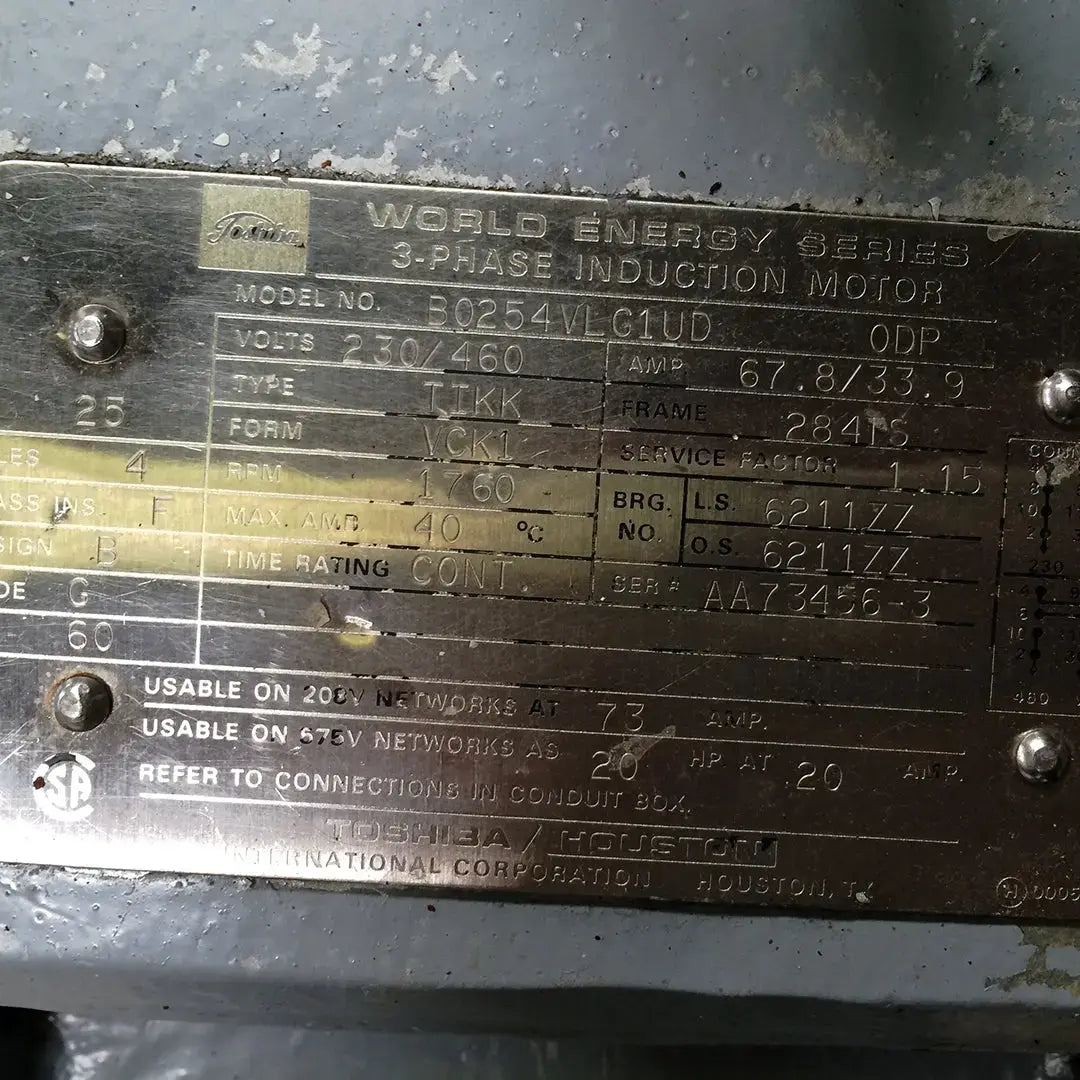 Mycom 6-cylinder Reciprocating Compressor. Model: F6C2. Serial: 10228. Made in Japan. Toshiba motor: 25 HP, 208-230/460V, 73-67.8/33.9 amps, 3-phase, 60 Hz, 284TS Frame. Previously run with freon refrigerant.